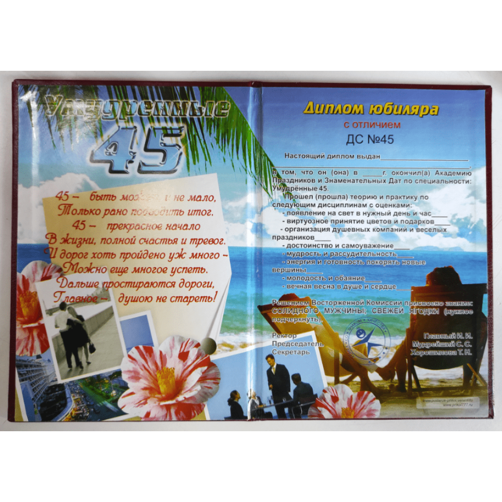 Диплом прикольный "45 лет Юбиляру" PT-DIP57