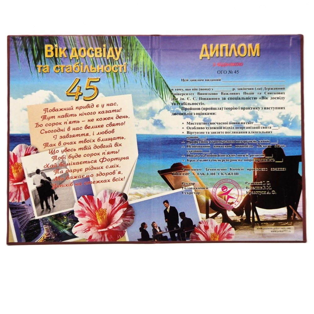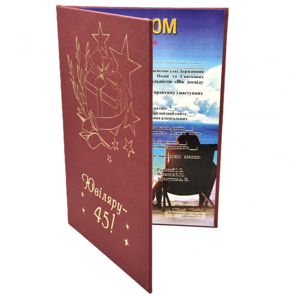 Диплом прикольный (украинский вариант) "45 лет Юбиляру" PT-DIP58