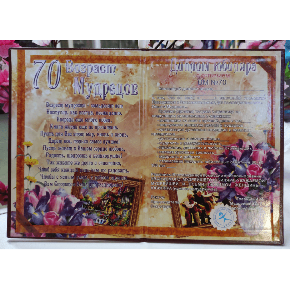Диплом прикольный "70 лет Юбиляру" PT-DIP72