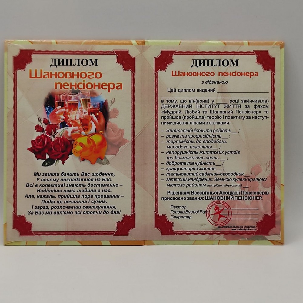 Диплом прикольный "Шановного пенсіонера" PT-DIP50