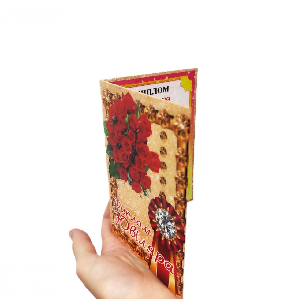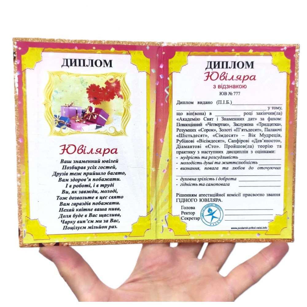 Диплом "Юбиляра" диплом на украинском языке, подарки не всегда могут быть дорогими, этот диплом для именинника, юбиляра, будет приятным и памятным подарком. В середине есть пожелание и строчки для кого предназначается диплом. Диплом сделан из плотного картона обтянут ламинированной картинкой.