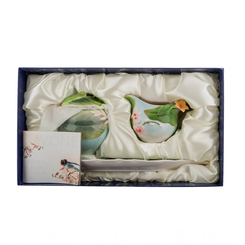 Это именно тот вариант, когда сахар из такой сахарницы слаще, а молоко из молочника намного вкуснее. Не менее интересно и оформление набора – рисунок в виде цветка и статуэтки птички. А если к этому добавить еще и декорирование большими цветами яркой покраски, то можно сделать четкий вывод – этот презент надолго запомнится собственной необычностью и полезностью.