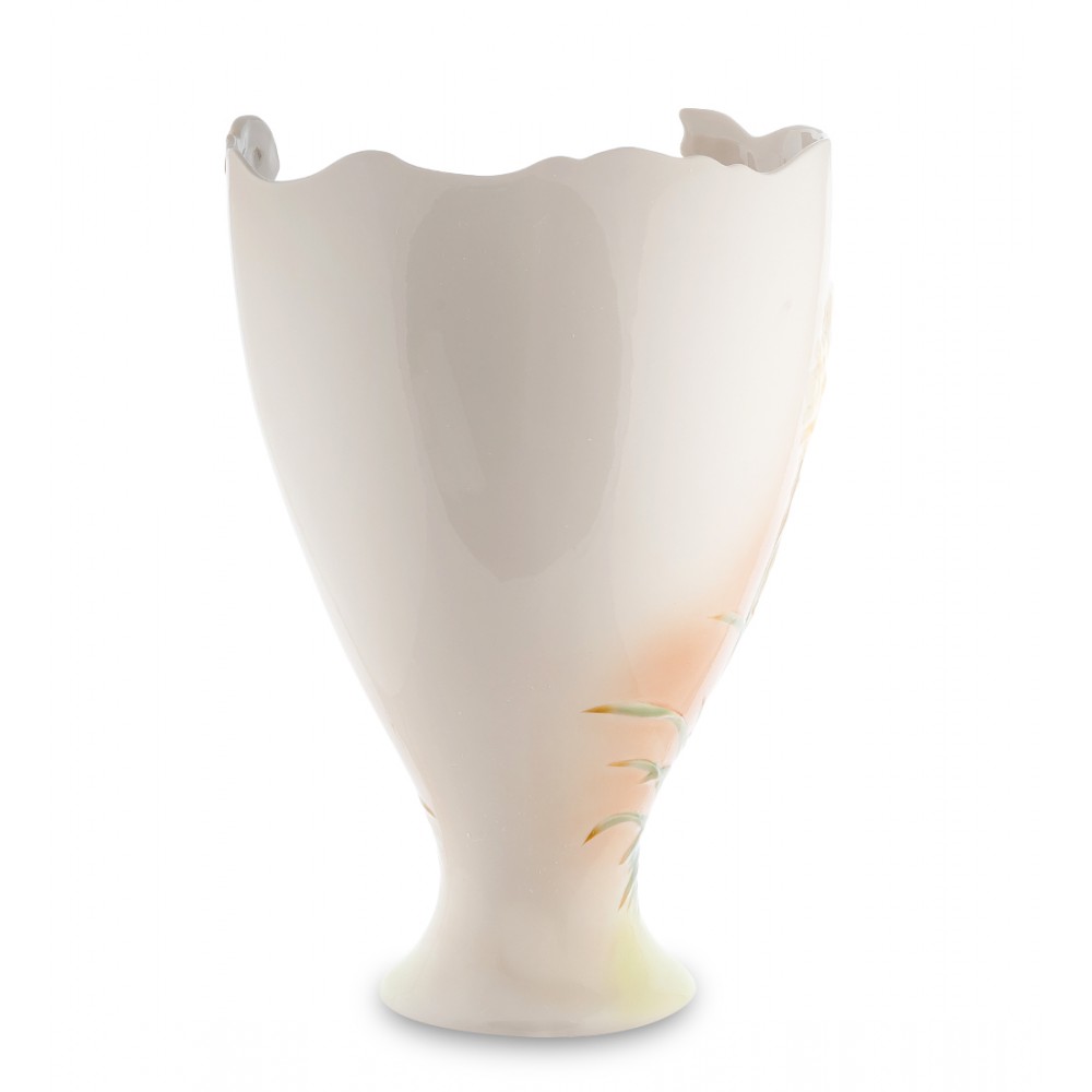 Довершает поразительную композицию ярко зеленая трава, на верхушке которой разместился бутон белого цвета. Фарфорову роспись вышла настолько идеальной, что какой бы вы цветок не поставили в вазу, он только сделает красивее композицию.