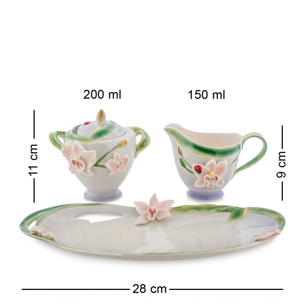 Емкость для сахара осыпана нежно-розовыми Орхидеями, а палитра цветов бело-голубых оттенков действительно радует глаз. Молочник мило украшен божьей коровкой. Нежный дизайн делает набор для чая неповторимым и желанным для коллекционеров. В комплекте маленькое блюдце для фруктов и сладостей к чаю.