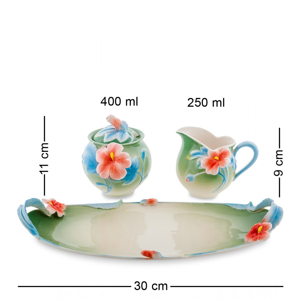 - Размеры изделия - Длина: 30 см; Ширина: 14 см; Высота: 12 см; Вес: 0.9 кг.; Объем молочника: 250 мл; Объем сахарницы: 400 мл;