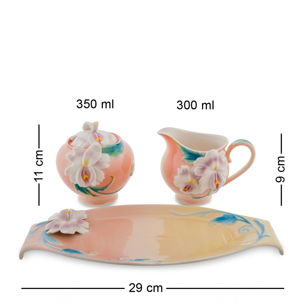 - Размеры изделия - Длина: 29 см; Ширина: 13 см; Высота: 12 см; Вес: 0.85 кг.; Объем молочника: 300 мл; Объем сахарницы: 350 мл;