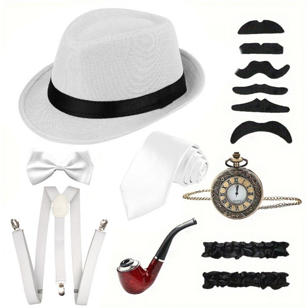 Гангстерский набор в белом цвете — это стильный комплект аксессуаров для образов в стиле 1920-х, который подходит для вечеринки, фотосессии, тематического выступления или костюмированного мероприятия. Такой набор часто выбирают для гангстерской вечеринки, где важна каждая деталь: от шляпы до мелких аксессуаров, создающих атмосферу тех самых времён. Белая шляпа в сочетании с классическими элементами делает образ ярким, нарядным и заметным — особенно на фоне темных костюмов и строгих луков.