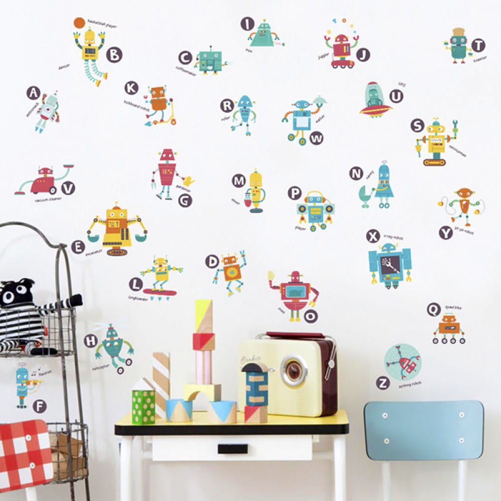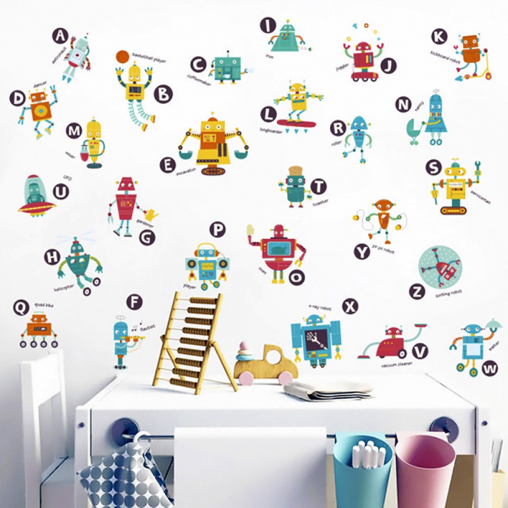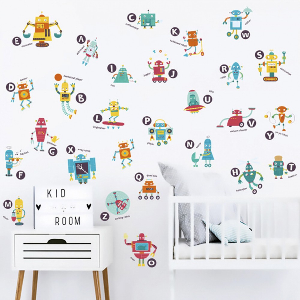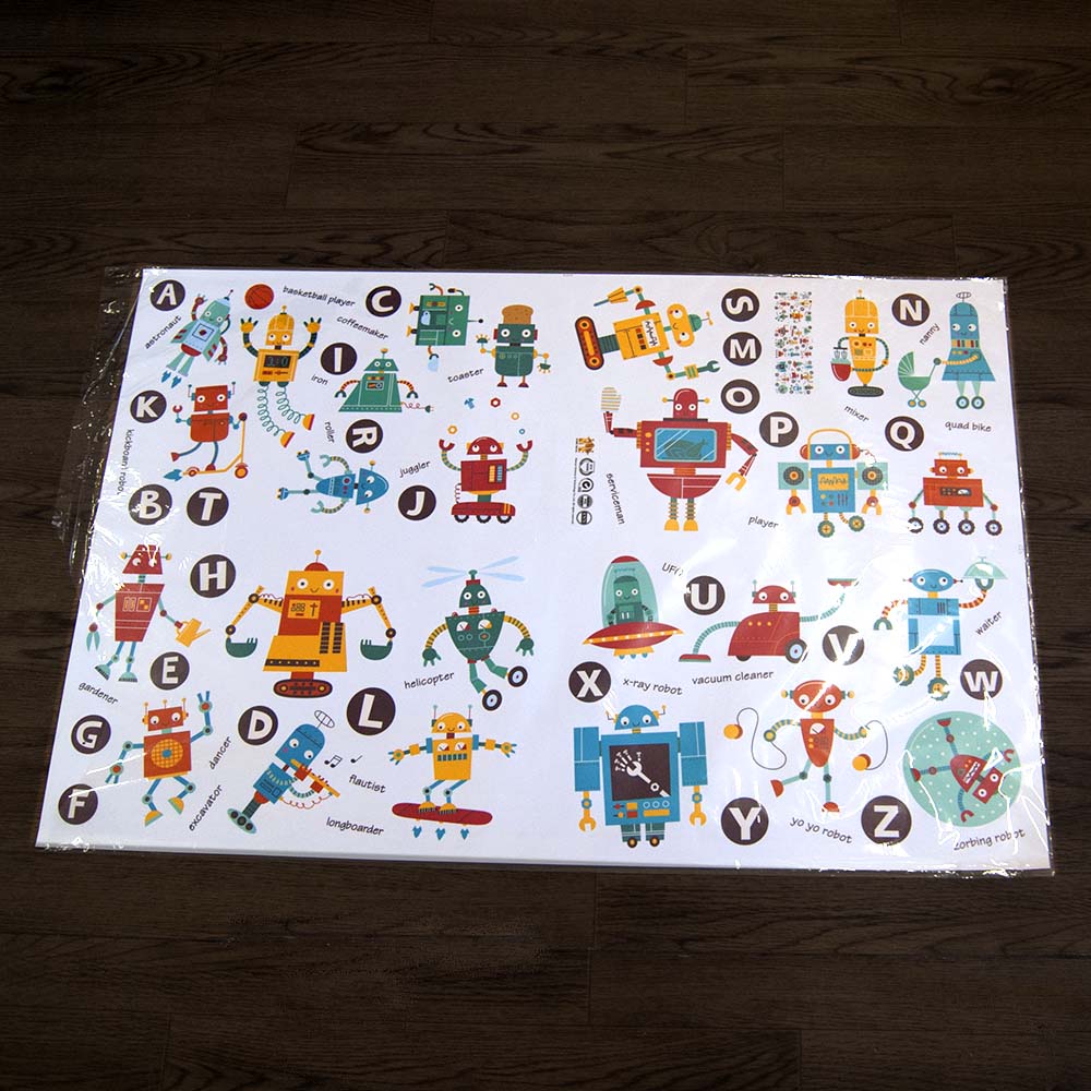 Интерьерная наклейка Детская Роботы HM94006 90х60см - это быстрый способ классно украсить свой дом. Интернет-магазин Подарок-ТУТ предлогает Вам купить интерьерные наклейки тематики детской, которые идеально подойдут на кухню, спальню, гостиную, детскую или игровую комнату. Украшение на стену оценят дети в своих спальнях или игровых комнатах. Интерьерная наклейка Детская Роботы HM94006 90х60см с принтом роботов с буквами англиского алфавита. Размер листа с наклейками: 60х90 см. Как 3D наклейка клеится на стену ? Способ поклейки очень прост. Для начала необходимо очистить поверхность, на которую необходимо наклееть. После снимаем пленку и переносим рисунок на стену или другую плоскость рукой или ветошью. На какие поверхности можно клеить интерьерную наклейку ? Поклейка возможна на любую ИДЕАЛЬНО ГЛАДКУЮ ГЛЯНЦЕВУЮ поверхность, например : стена окрашенная глянцевой краской без каких-либо рельефов ( в краске не должно быть мелового компонента), стекло, зеркало, лакированные поверхности, гладкий пластик. На обои клеить НЕЛЬЗЯ. Ухаживать за стикерами на стену также достаточно легко, для этого необходимо лишь иногда протирать их влажной губкой или тряпкой. Яркость и насыщенность наклеек не меняется с течением времени, кроме того они абсолютно устойчивы к влажности.