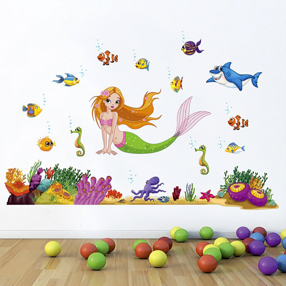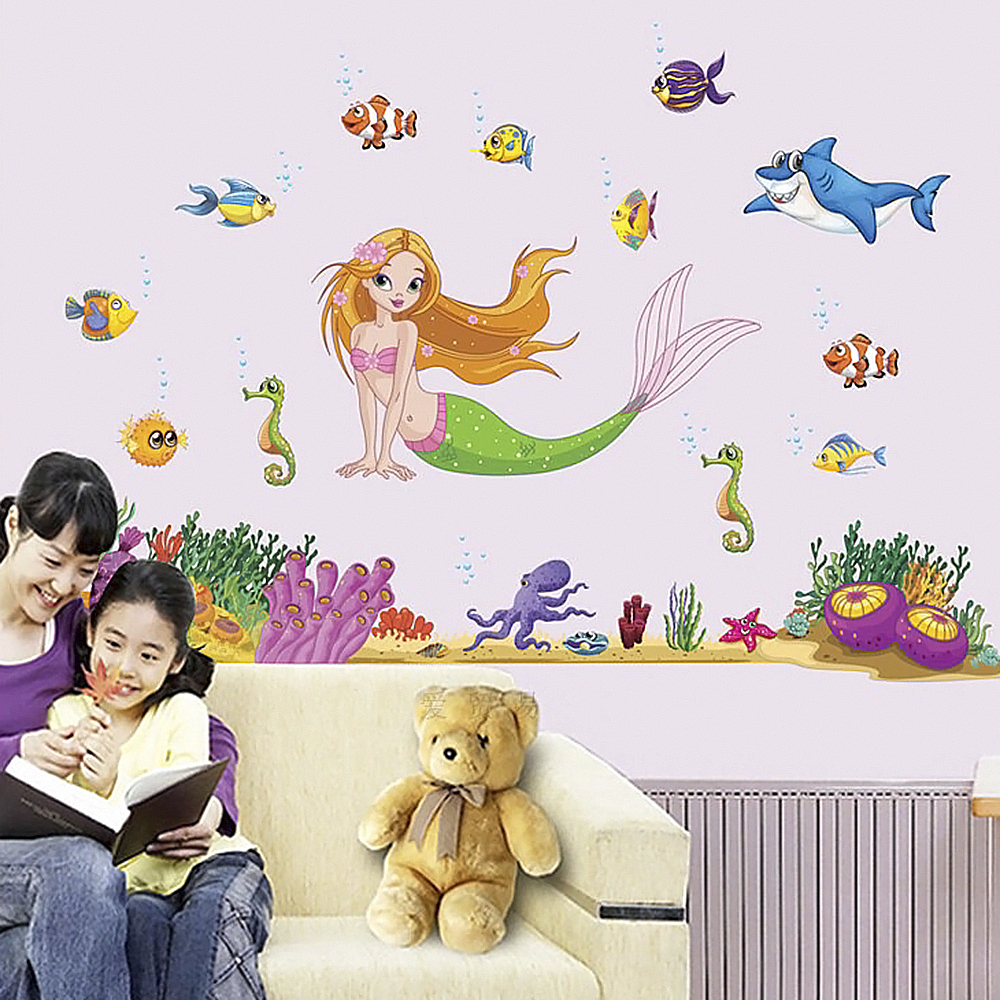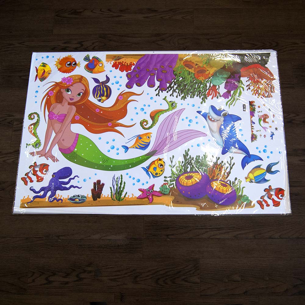 Интерьерная наклейка Детская Русалочка JM7292 90х60см - это быстрый способ классно украсить свой дом. Интернет-магазин Подарок-ТУТ предлогает Вам купить интерьерные наклейки детской тематики, которые идеально подойдут на кухню, спальню, гостиную, детскую или игровую комнату. Украшение на стену оценят дети в своих спальнях или игровых комнатах. Интерьерная наклейка Детская Русалочка JM7292 90х60см с принтом русалочки и морских рыбок. Размер листа с наклейками: 60х90 см. Как 3D наклейка клеится на стену ? Способ поклейки очень прост. Для начала необходимо очистить поверхность, на которую необходимо наклееть. После снимаем пленку и переносим рисунок на стену или другую плоскость рукой или ветошью. На какие поверхности можно клеить интерьерную наклейку ? Поклейка возможна на любую ИДЕАЛЬНО ГЛАДКУЮ ГЛЯНЦЕВУЮ поверхность, например : стена окрашенная глянцевой краской без каких-либо рельефов ( в краске не должно быть мелового компонента), стекло, зеркало, лакированные поверхности, гладкий пластик. На обои клеить НЕЛЬЗЯ. Ухаживать за стикерами на стену также достаточно легко, для этого необходимо лишь иногда протирать их влажной губкой или тряпкой. Яркость и насыщенность наклеек не меняется с течением времени, кроме того они абсолютно устойчивы к влажности.