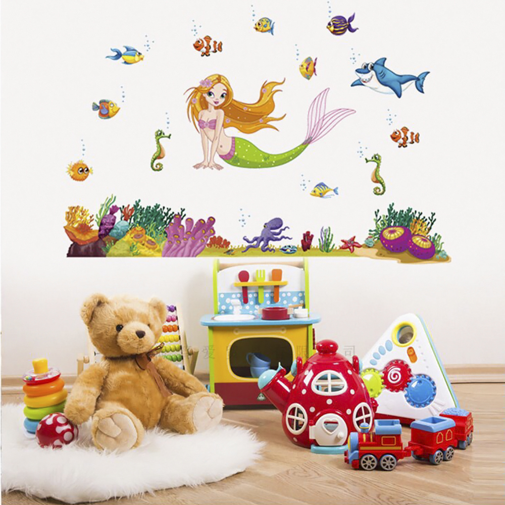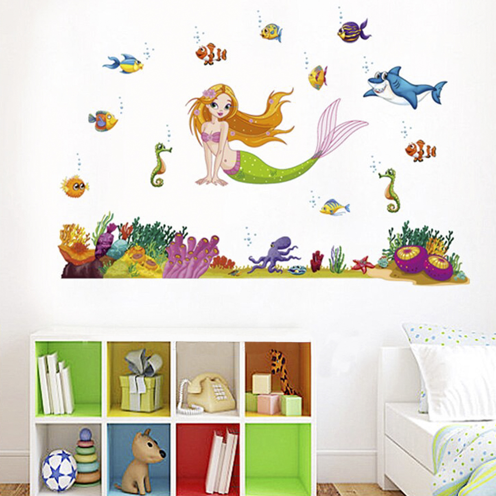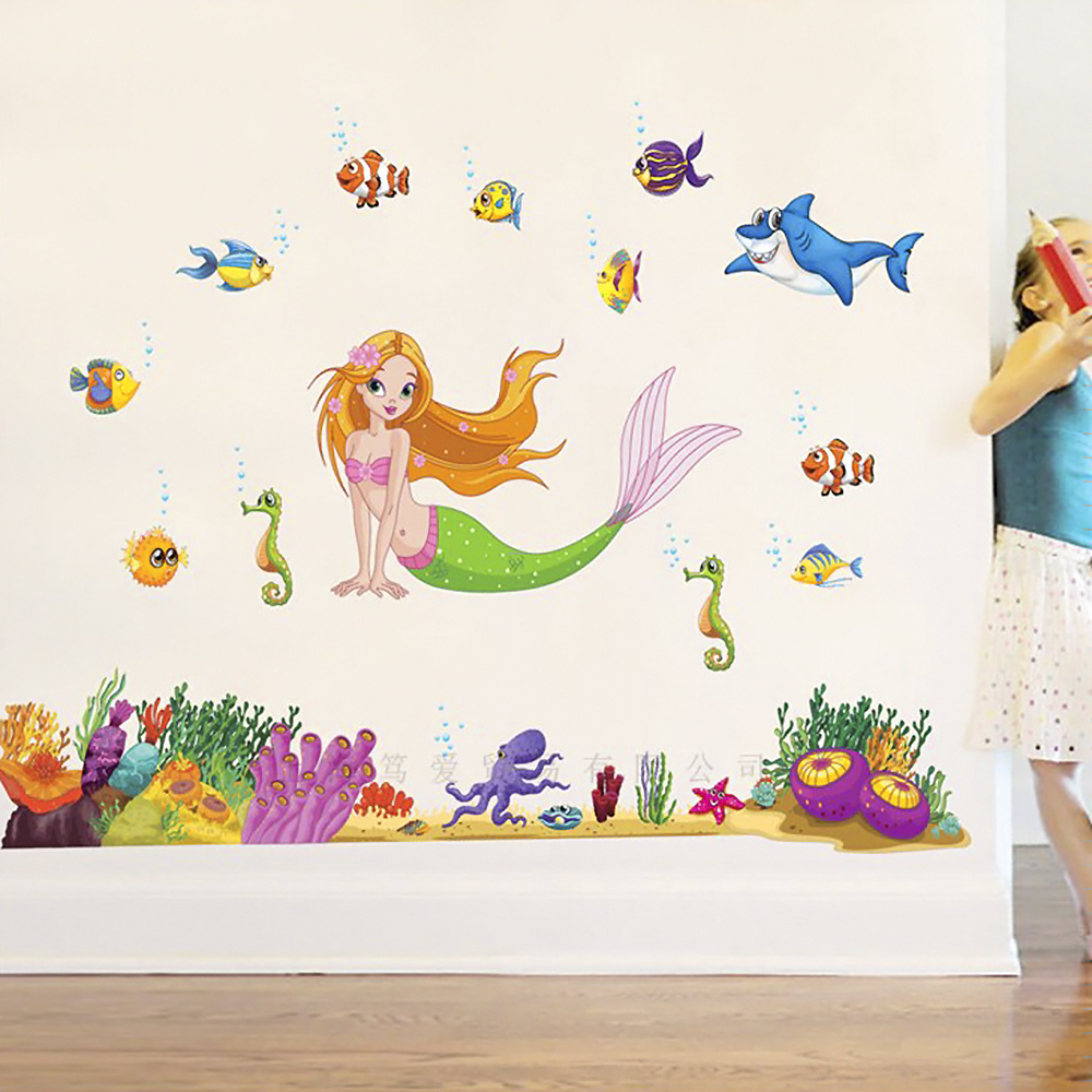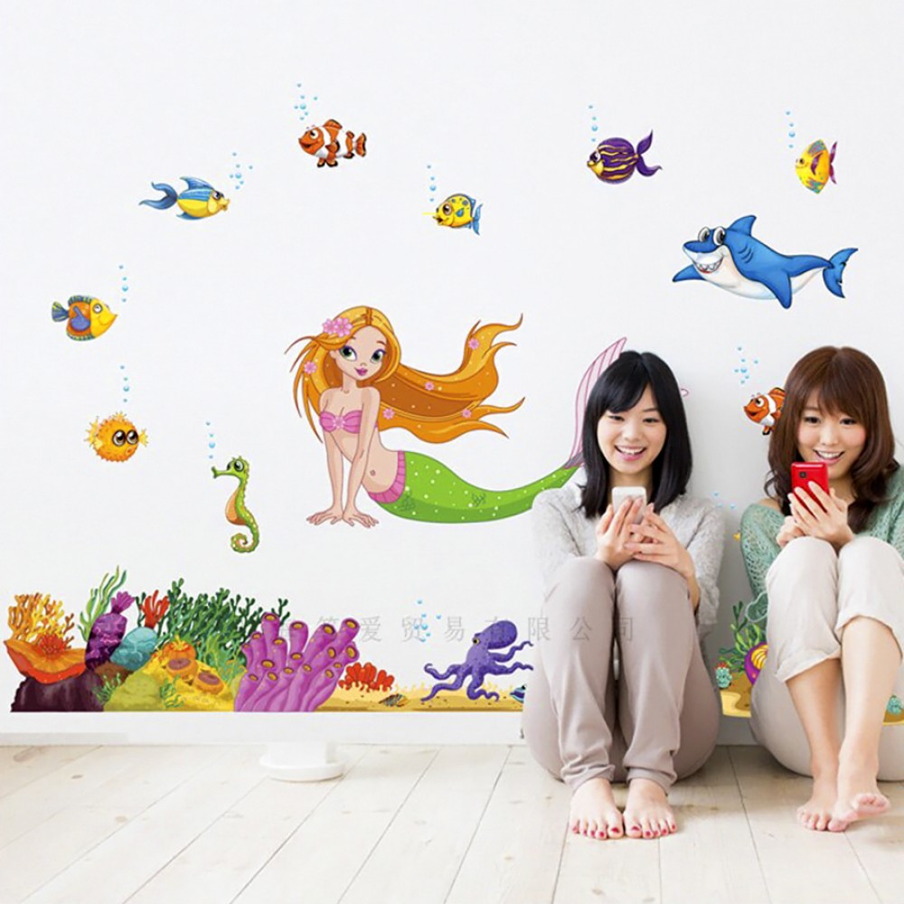 Интерьерная наклейка Детская Русалочка JM7292 90х60см - это быстрый способ классно украсить свой дом. Интернет-магазин Подарок-ТУТ предлогает Вам купить интерьерные наклейки детской тематики, которые идеально подойдут на кухню, спальню, гостиную, детскую или игровую комнату. Украшение на стену оценят дети в своих спальнях или игровых комнатах. Интерьерная наклейка Детская Русалочка JM7292 90х60см с принтом русалочки и морских рыбок. Размер листа с наклейками: 60х90 см. Как 3D наклейка клеится на стену ? Способ поклейки очень прост. Для начала необходимо очистить поверхность, на которую необходимо наклееть. После снимаем пленку и переносим рисунок на стену или другую плоскость рукой или ветошью. На какие поверхности можно клеить интерьерную наклейку ? Поклейка возможна на любую ИДЕАЛЬНО ГЛАДКУЮ ГЛЯНЦЕВУЮ поверхность, например : стена окрашенная глянцевой краской без каких-либо рельефов ( в краске не должно быть мелового компонента), стекло, зеркало, лакированные поверхности, гладкий пластик. На обои клеить НЕЛЬЗЯ. Ухаживать за стикерами на стену также достаточно легко, для этого необходимо лишь иногда протирать их влажной губкой или тряпкой. Яркость и насыщенность наклеек не меняется с течением времени, кроме того они абсолютно устойчивы к влажности.