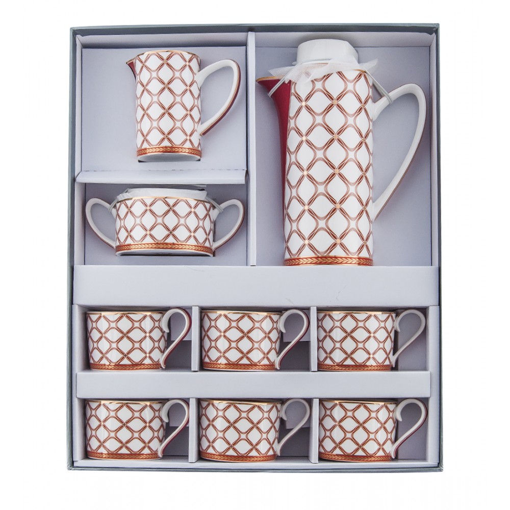 Чайный сервиз ''Элегантность'', рассчитанный на шесть человек, настоящее олицетворение изысканности. Мир изменяется с довольно большой скоростью, но бытовой комфорт остается и создает его именно человек. Уют и удобство обязаны присутствовать во всём, на кухне в особенности. Насыщенность тонов и оригинальный рисунок подчеркивают благородство фарфора и уникальность сервиза.