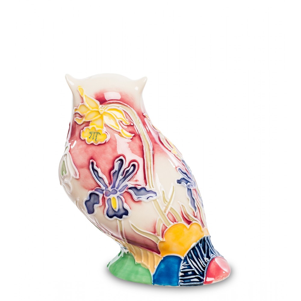 Совушка изготовлена из тонкого белого, как первый целомудренный снег, фарфора и украшена нежной росписью с цветочным орнаментом. На миловидном немного мутноватом розовом фоне распустили собственные лепесточки жёлтые нарцисы и прочие, классически весенние представители флоры. Часть находящаяся внизу птицы мудрости украшена ассиметричными пятнами немного приглушенных цветов с компонентами обычного геометрического орнамента, что делает фигурку немного игривой.