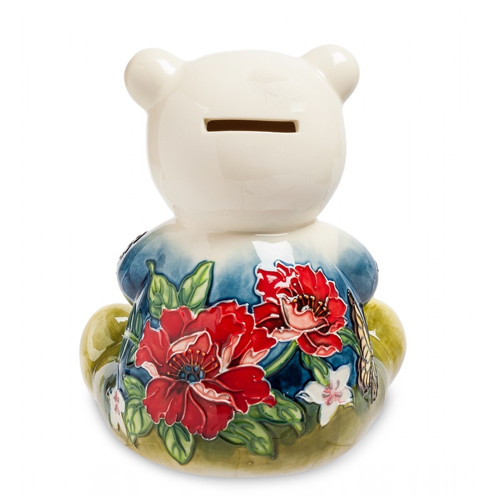Его глаза-бусины, маленький нос и круглые бровки делают мишку еще более притягивающим. Он удивительно обаятельный, а цветы на его теле дополняют копилку и создают полноценный яркий, необычный образ. Цветы настолько красивы, и яркие, что никто не скажет, что ваш мишка – это унылая копилка.