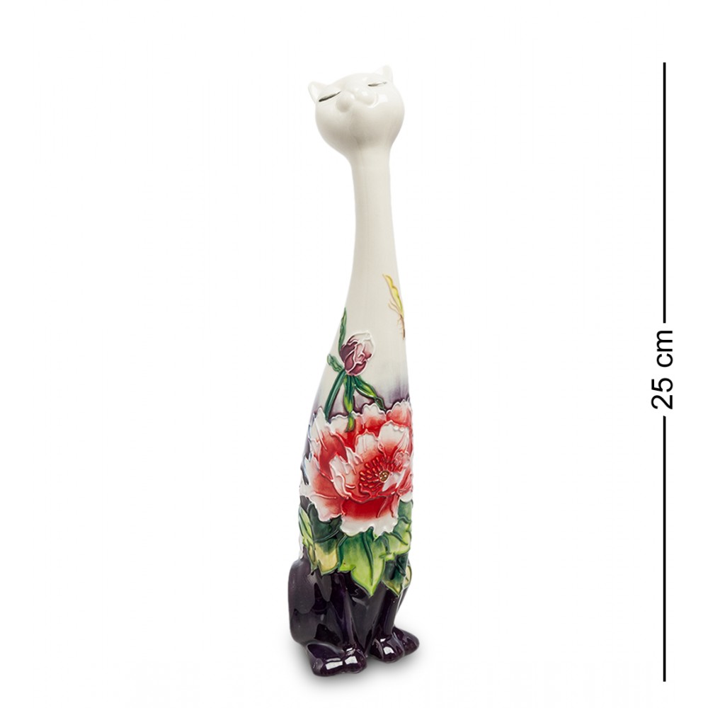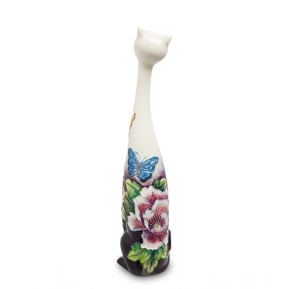 У фарфоровой кошки, высота которой 25 сантиметров, черные лапки и нижняя часть туловища. Среднюю часть статуэтки покрывают изображения больших ярких цветов, а к верху кошки – шее и голове – оформители решили кистями не прикасаться. Раскраска тела кошки и черный низ, цветом напоминающий плодородную почву, создает впечатление, что кошечка решила отдохнуть в садике, присев на цветочную клумбу.