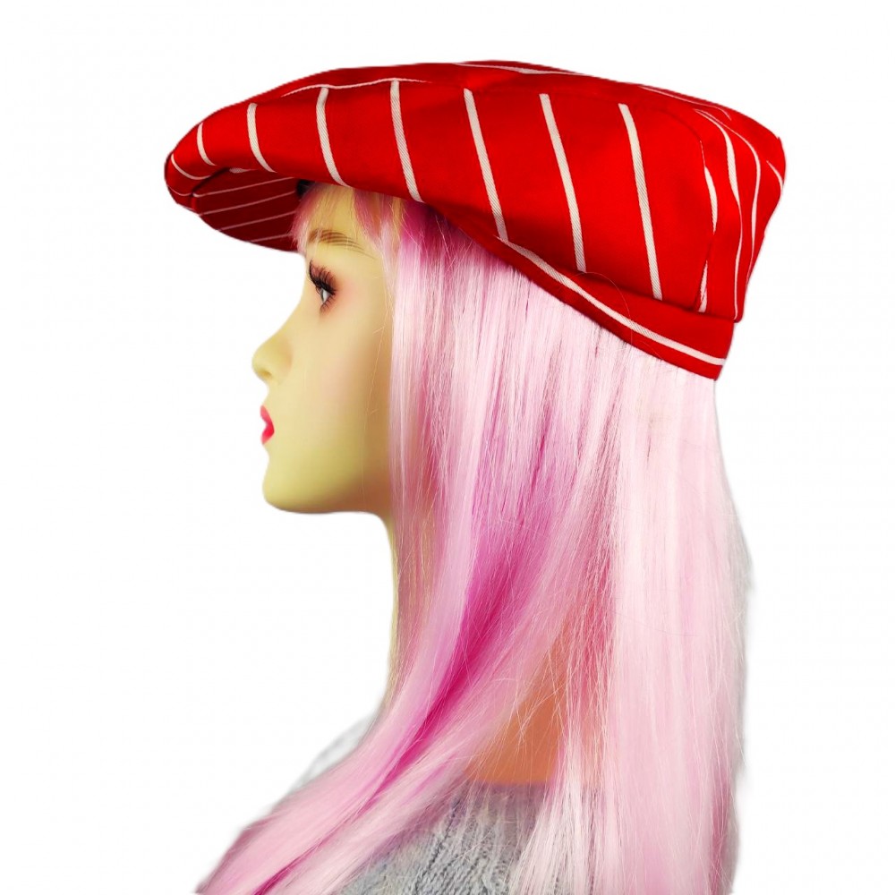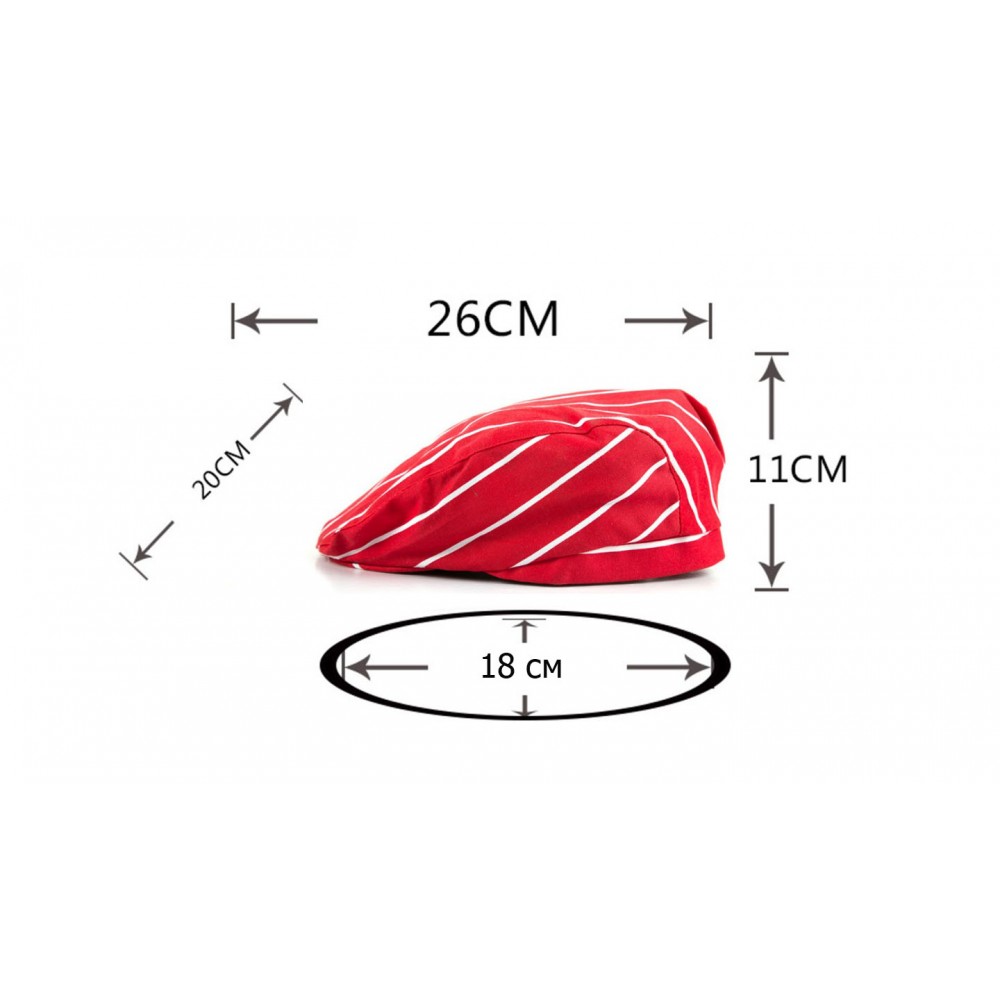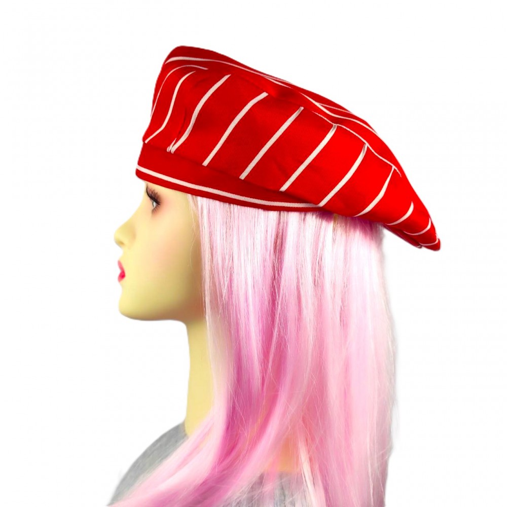 Этот стильный головной убор в насыщенном красном цвете с изящными диагональными полосками воплощает собой симбиоз классического дизайна и современных тенденций профессиональной кухни. Белые линии на ярком фоне создают динамичный узор, который прекрасно вписывается в атмосферу активной работы ресторана.