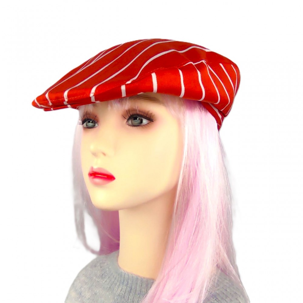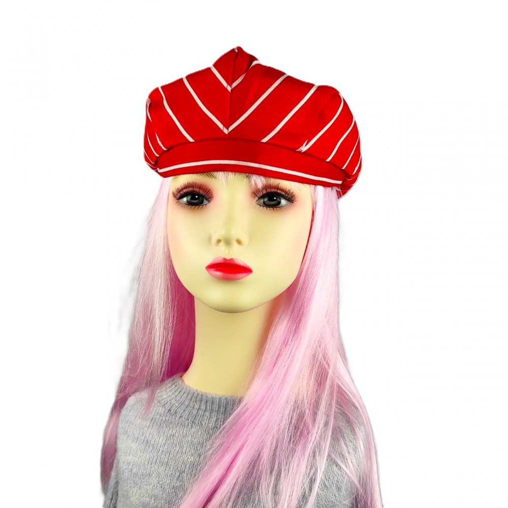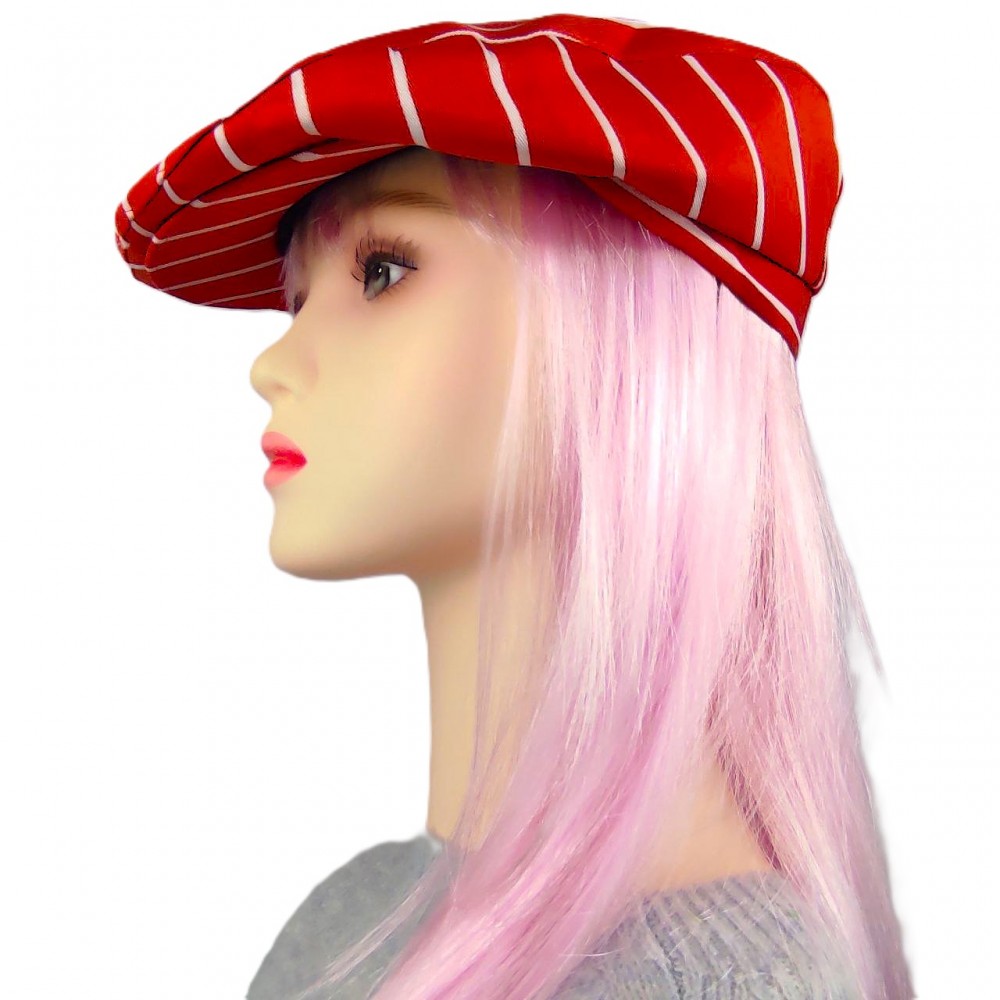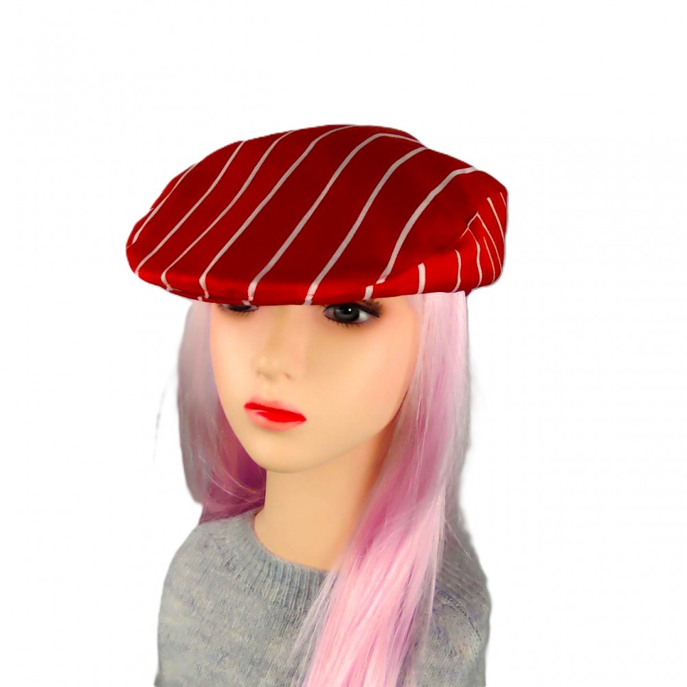 Этот стильный головной убор в насыщенном красном цвете с изящными диагональными полосками воплощает собой симбиоз классического дизайна и современных тенденций профессиональной кухни. Белые линии на ярком фоне создают динамичный узор, который прекрасно вписывается в атмосферу активной работы ресторана.