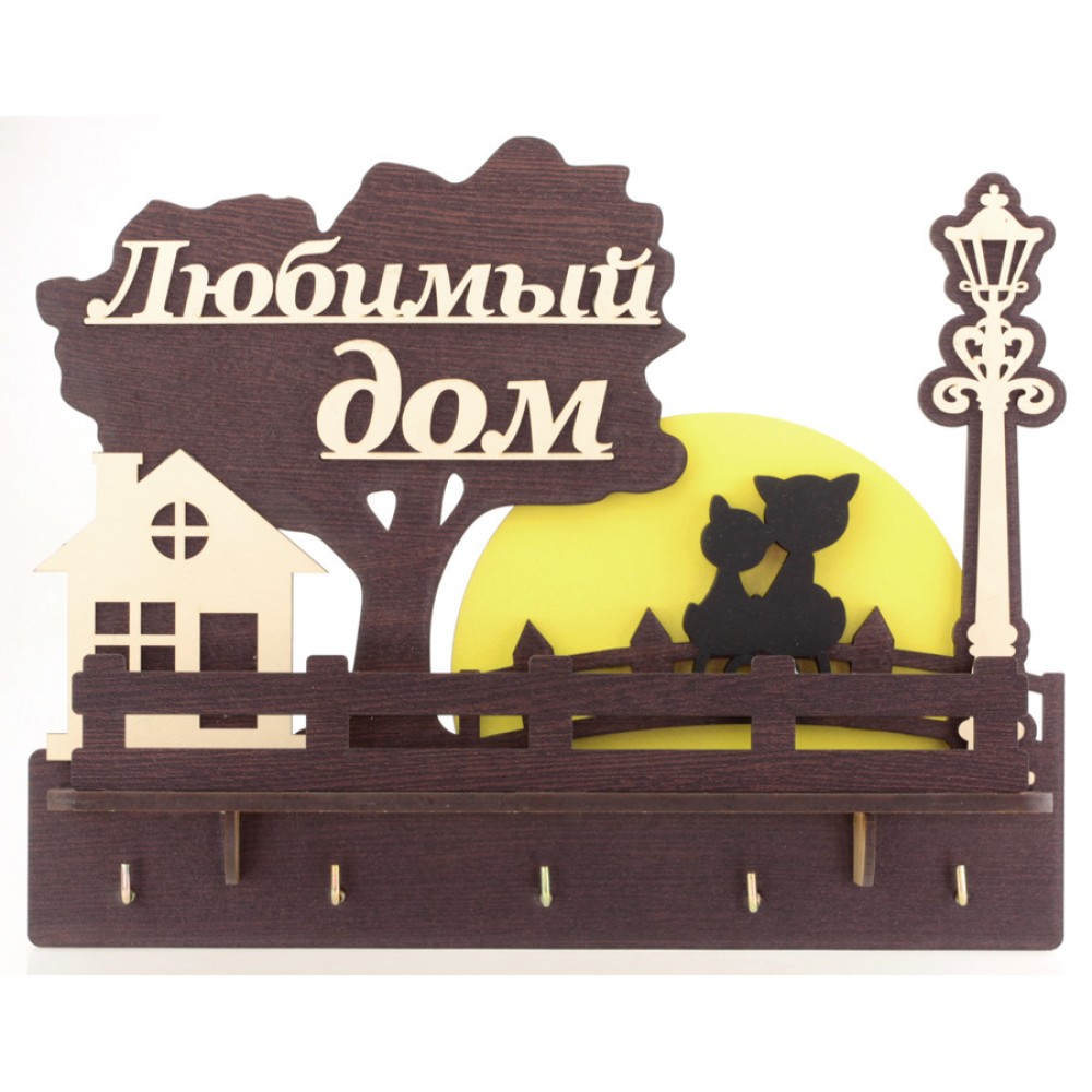 На закате солнца сидят два котенка, а рядом уютный домик и дерево счастья.Эта ключница будет замечательным и полезным подарком! Ключница рассчитана на 5 комплектов ключей. Над крючками для ключей находится полезная полочка размером 29*7 см. Туда можно поставить и положить различные полезные мелочи. Например, средства по уходу за одеждой и обувью. Сзади имеется крепление для подвески на стену. Эта ключница благодаря своему дизайну отлично впишется в практически любой интерьер. И станет милым и практичным подарком для дома и близких людей.