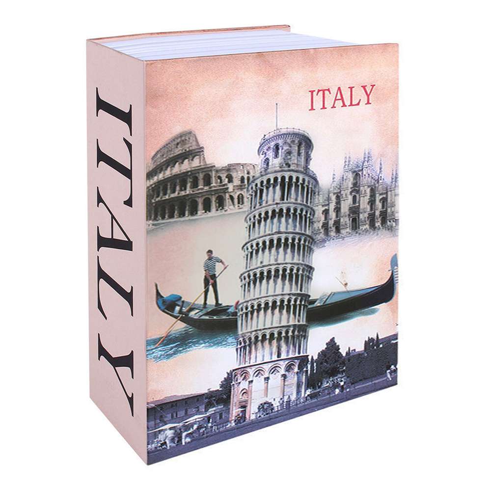 Книга сейф (18см) Италия – стильный, аристократический подарок для тех, кто любит читать и считать! Переданный нам от деда-прадеда способ хранить свои сбережения в книгах нашел свое современное воплощение! Оригинальный сейф в виде книги, книга-тайник, надежно будет сохранять ценности своего хозяина, находясь в книжном шкафу с обычными книгами. Металлическая коробка замаскирована под обычную книгу, облицована пластиковой обшивкой с принтом пизы каноэ и надписью ITALY. Внутренние размеры позволят спрятать пачки купюр толщиной до 5 см, а также хранить документы размером 17х10см. Каркас книги-обманки обработан таким образом, чтобы создать иллюзию множества страниц, соединённых вместе. Выглядит очень реалистично. В ряду на полке с другими книгами практически не отличить от обычной книги. Книга сейф – отличный подарок для ваших друзей, родных, коллег и начальства. Можете подарить такой подарок на день рождения или оригинально вручить на свадьбу молодоженам. В комплекте с книгой поставляется 2 ключа.