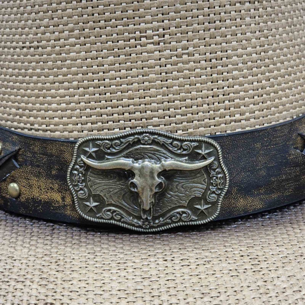 Ковбойская шляпа Texas Bull из соломы с бронзовым декором и тисненым ремнем, универсальный размер 58–59 см