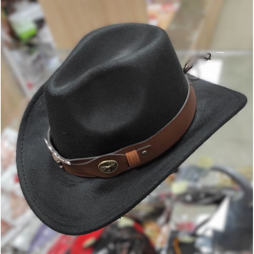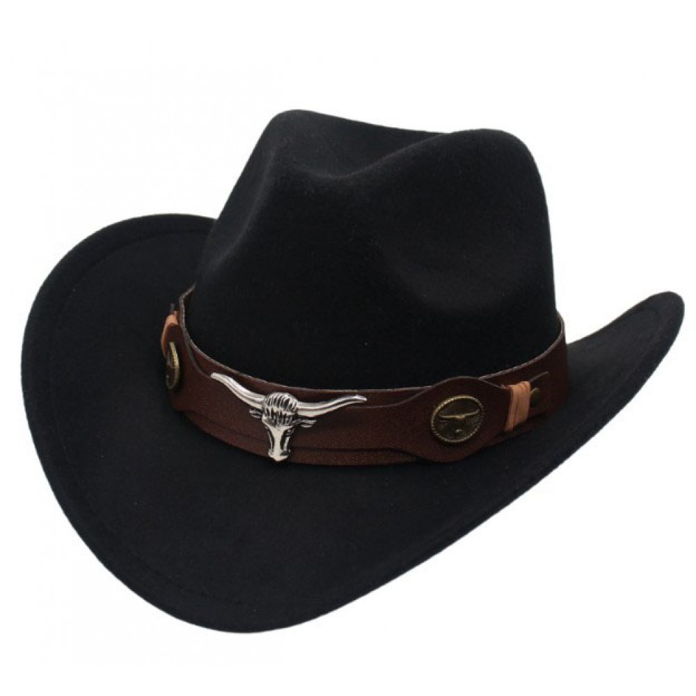 Ковбойская шляпа взрослая M (56–58 см) чёрная с коричневым ремнём и металлическим быком