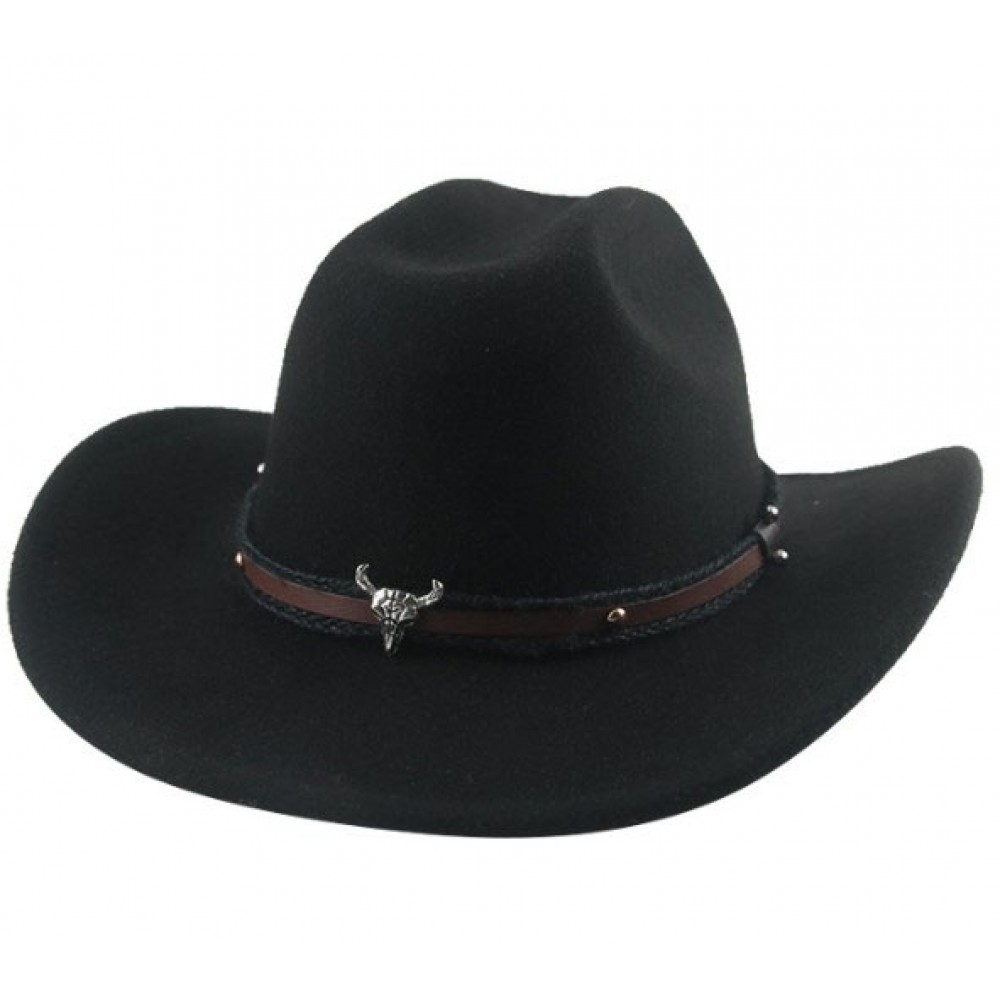 Ковбойская шляпа чёрная с металлическим черепом и кожаными завязками — это не просто головной убор. Это настроение. Это характер. Это когда ты надеваешь её — и всё, ты будто в другом фильме. Широкие поля ловят ветер, плотный фетр держит форму, а спереди блестит череп быка — не кричит, а уверенно говорит: «Да, я тут главный».