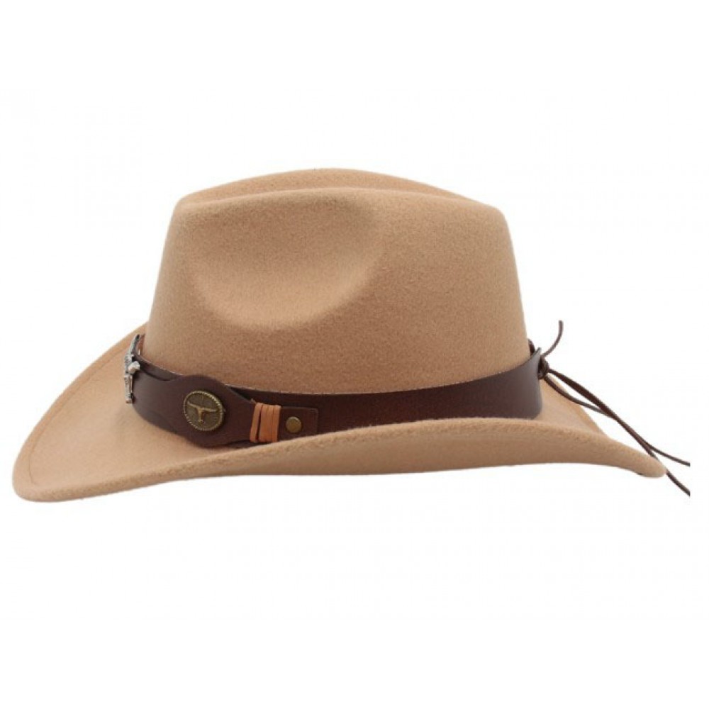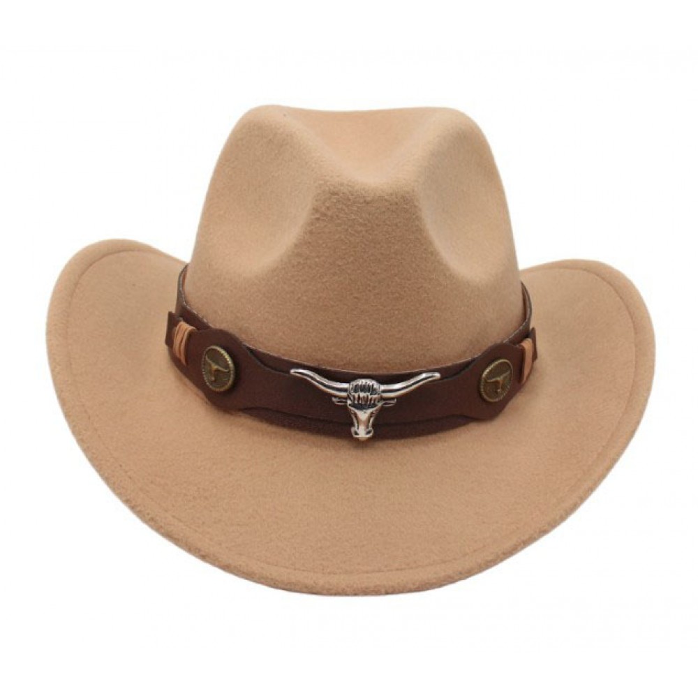 Особое внимание привлекает коричневый кожаный ремень с металлическим декором в виде головы быка — этот элемент делает шляпу заметной и брутальной. Размер M рассчитан на взрослых с обхватом головы 56-58 см, что делает модель универсальной для повседневного использования, фотосессий или костюмированных вечеринок.