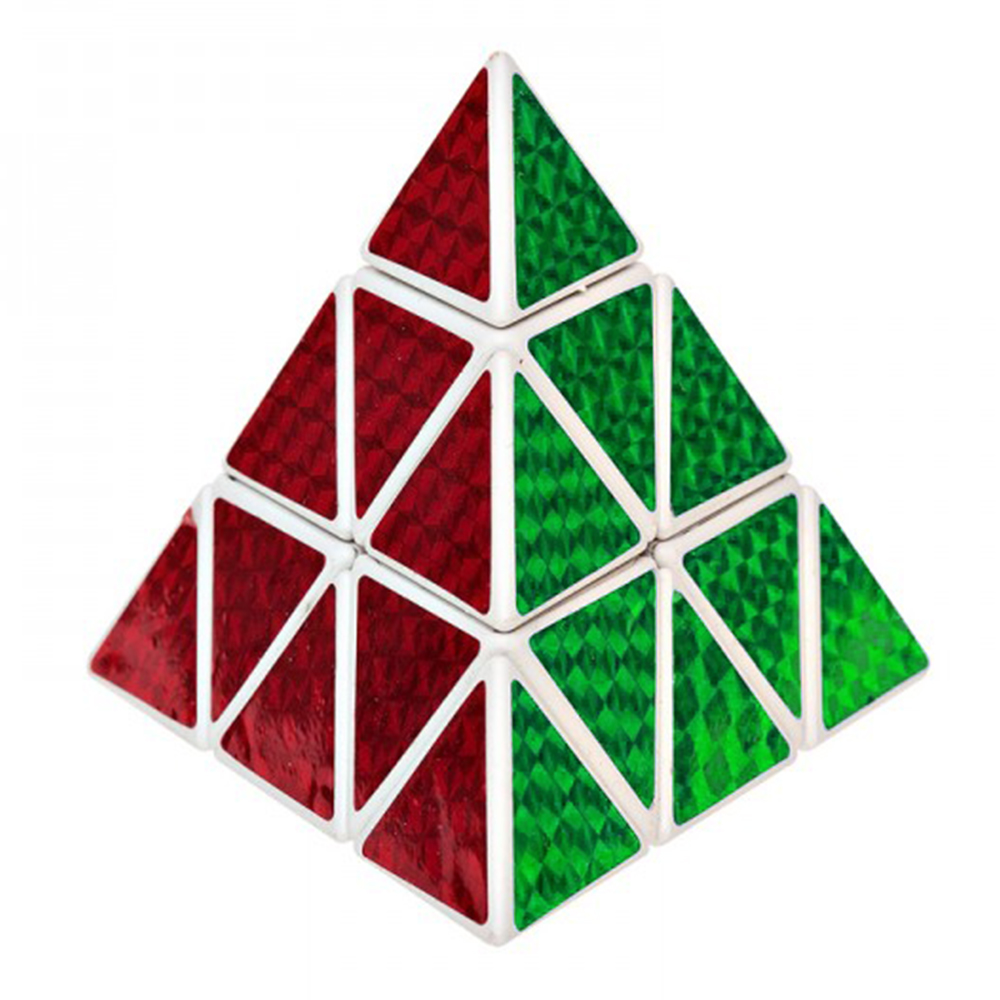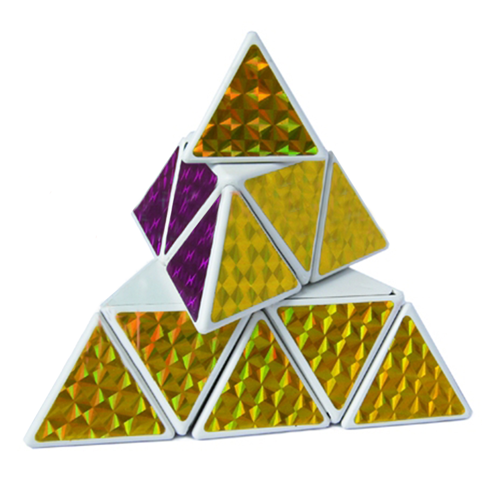 Пирамидка представляет собой четырехгранный тетраэдр, каждая сторона – равносторонний треугольник с длиной стороны 10см. Вся игрушка состоит в свою очередь из более маленьких тетраэдров со стороной 3 см. Они соединены в одно целое таким образом, что могут вращаться. Каждая грань поделена относительно каждого из трех оснований на три уровня, и каждый уровень может вращаться, относительно основания. Это сооружение можно назвать тетраэдром Рубика. Головоломка сделана из белой пластмассы, наклейки на гранях – блестящая пленка с голограммой. Упаковка – картонная коробочка.