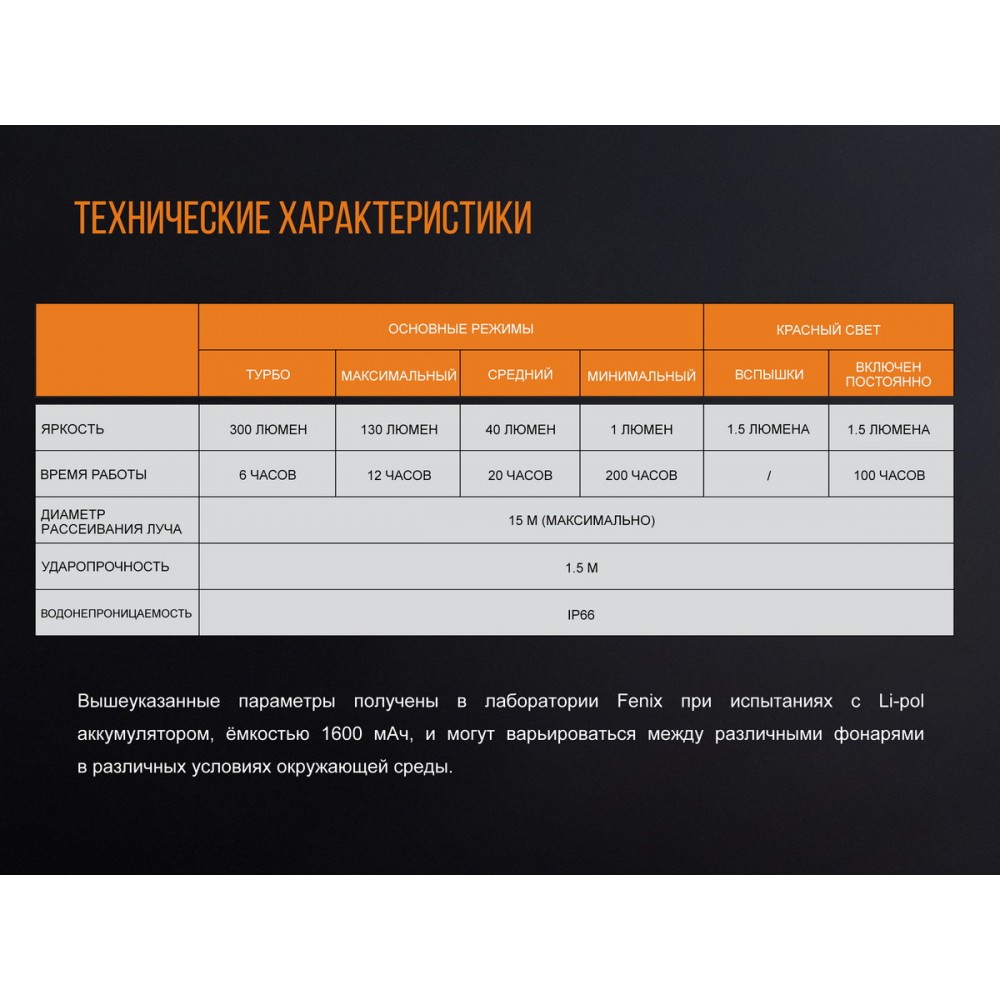 | Яркость | 300 люмен | 130 люмен | 40 люмен | 1 люмен | 1.5 люмена | 1.5 люмена | |