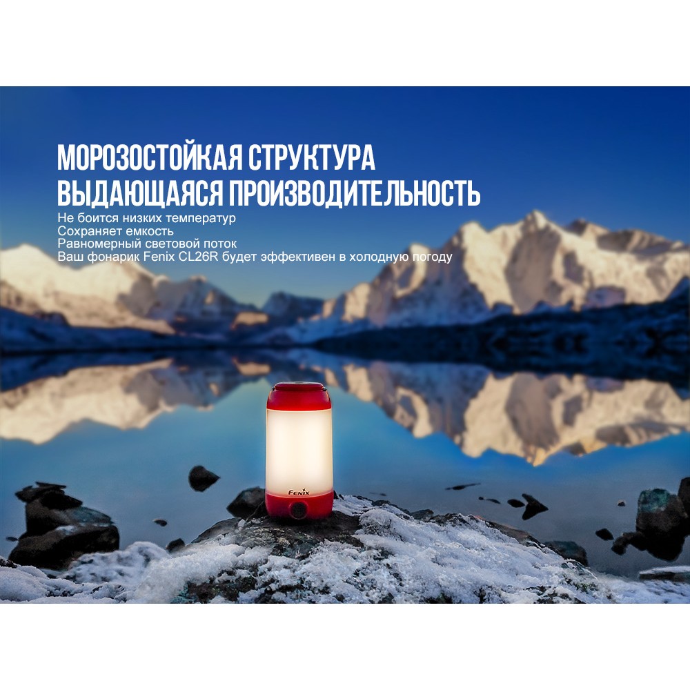 Модель Fenix CL26R разработана для всех туристов, любителей пикников и рыбалки. Это кемпинговый фонарь, дающий рассеянный свет и качественно освещающий пространство в любом направлении. Он отлично приспособлен к эксплуатации в полевых условиях, сделан крепким, защищенным от дождя, очень прост в использовании.