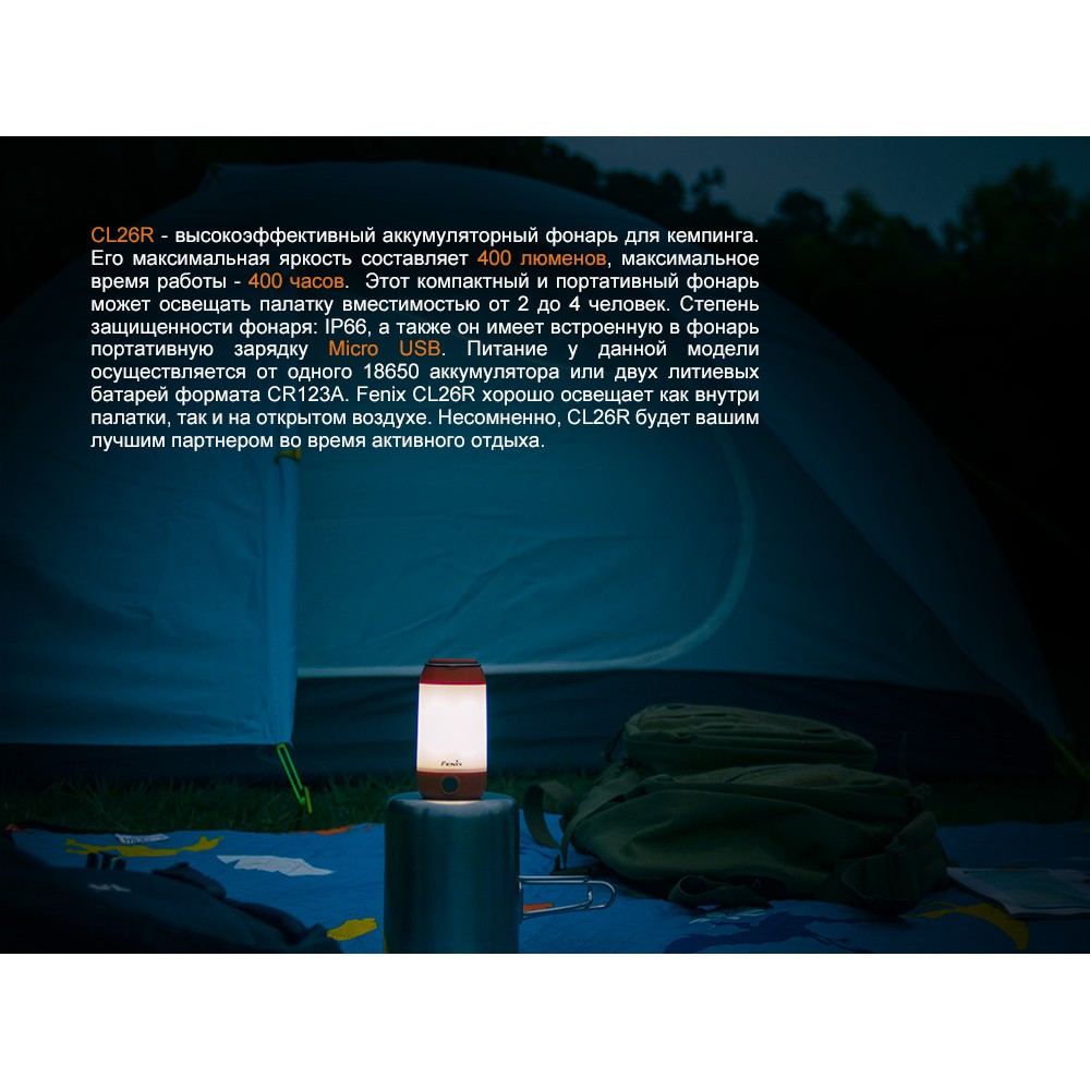 Модель Fenix CL26R разработана для всех туристов, любителей пикников и рыбалки. Это кемпинговый фонарь, дающий рассеянный свет и качественно освещающий пространство в любом направлении. Он отлично приспособлен к эксплуатации в полевых условиях, сделан крепким, защищенным от дождя, очень прост в использовании.