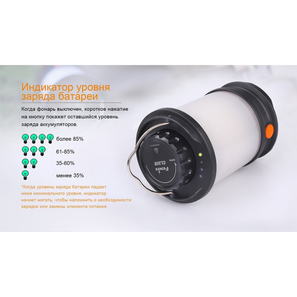 Время работы фонаря в каждом из доступных для выбора режимов напрямую зависит от емкости используемых элементов питания. Полный комплект составляют три аккумулятора размером 18650. Однако следует отметить, что Fenix CL30R может работать и на одном или двух элементах питания, если нет возможности установить сразу целый комплект. При использовании фирменных батарей на 2600 мАч, время работы в различных режимах составит от 4 с половиной, до 300 часов. Эти показатели можно увеличить, если использовать более емкие аккумуляторы на 3500 мАч. Тогда время автономной работы кемпингового фонаря составит от 6 до 400 часов. Контролировать уровень заряда пользователь может в любое время с помощью встроенного индикатора. Чтобы его активировать, достаточно один раз нажать на кнопку выключенного фонаря. Если будут светиться все 4 лампочки индикатора, значит заряда – более 85%. Только три светящиеся лампочки говорят об уровне заряда в пределах 61-85%. Если осталось 36-60% заряда, то включатся всего две лампочки. Ну а единственная работающая лампочка означает, что заряда меньше 35%.