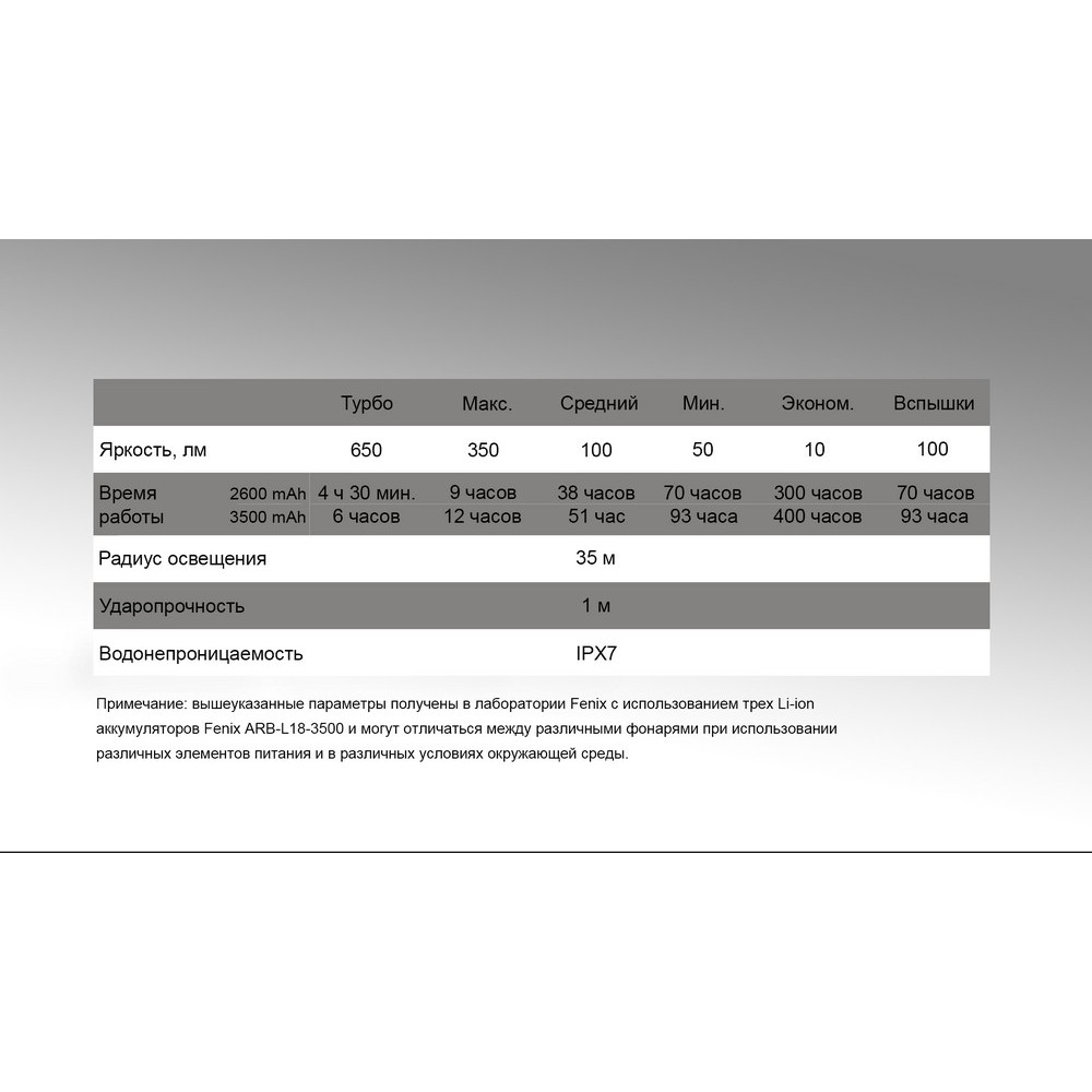 Комплектация | Светильник, уплотняющее кольцо, микро-USB кабель, АКБ 18650 ARB-L18-2600 (2600 мАч) – 3 шт. | ||||||