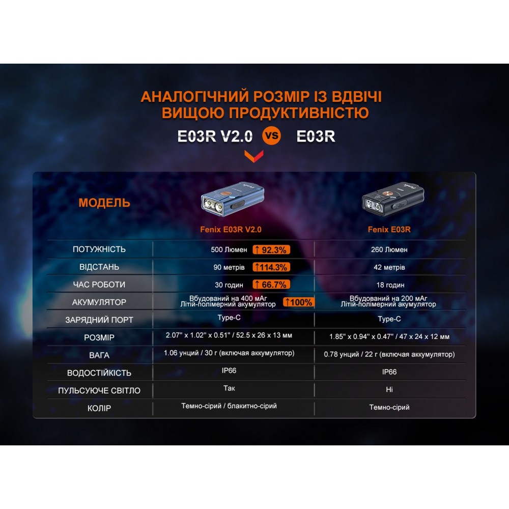 Фонарь-брелок Fenix E03R V2.0, металлическое кольцо, зарядный кабель USB Type-C, гарантия, инструкция по эксплуатации.