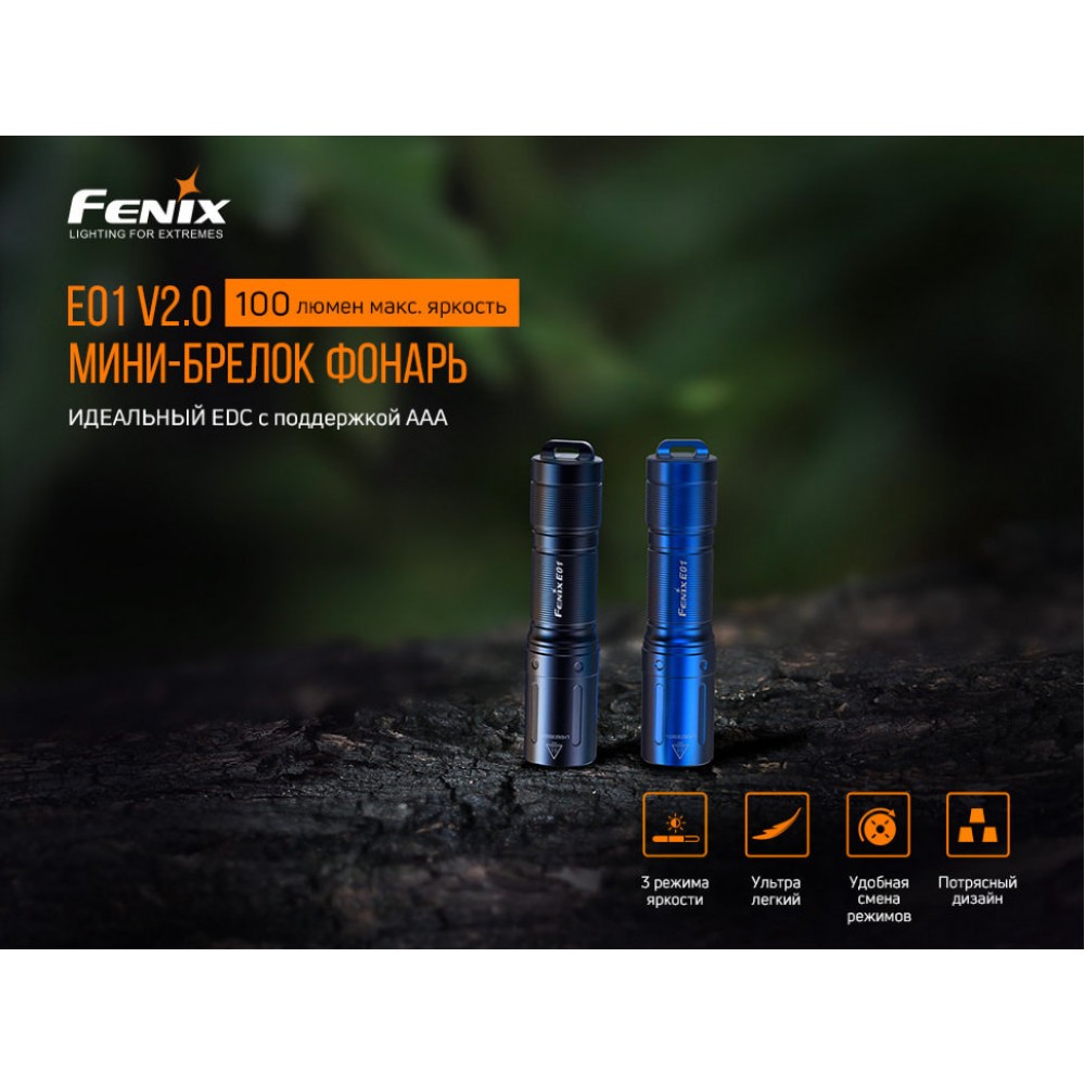 Комплектация | Фонарь Fenix E01 V2.0, батарея типа ААА, кольцо для ключей, запасное кольцо, руководство пользователя, талон гарантии. | ||