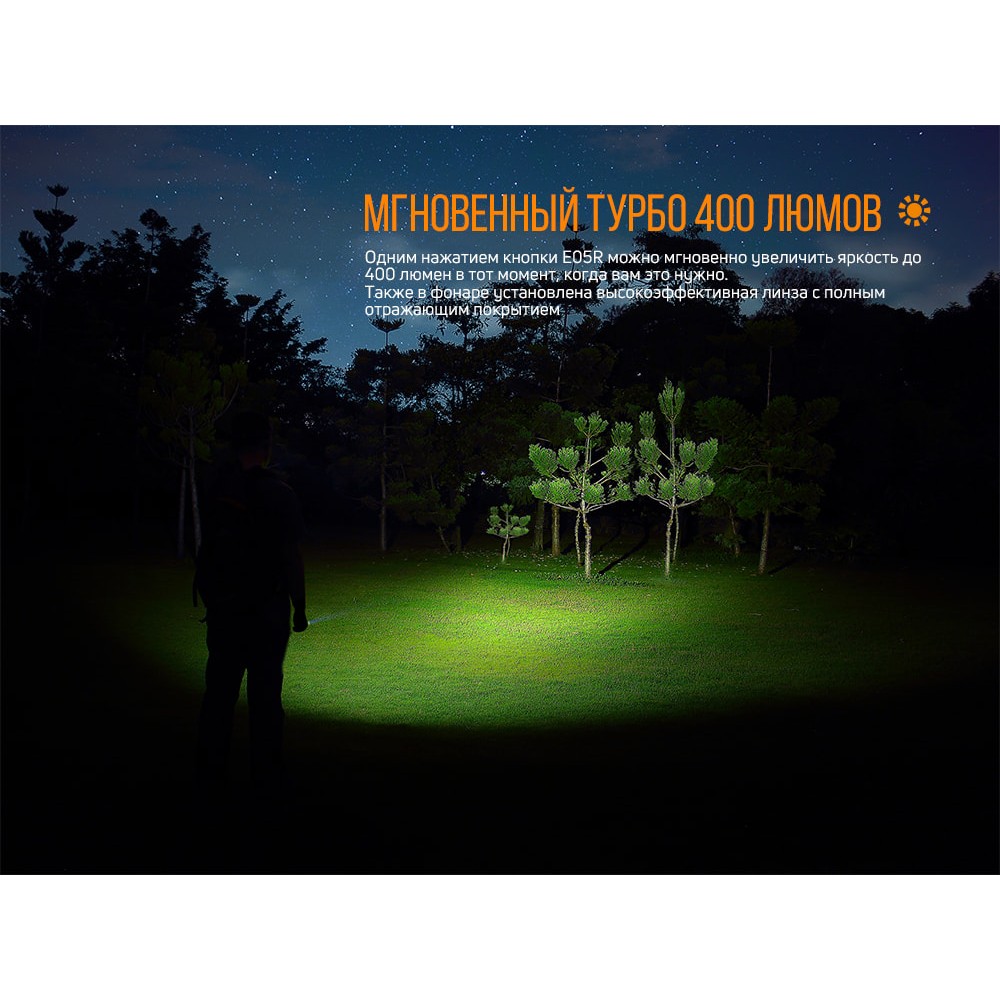 фонарь модели Fenix E05R, кабель для зарядки micro-USB, кольцо на ключе, запасное уплотнительное кольцо, инструкция пользователя, талон гарантии.
