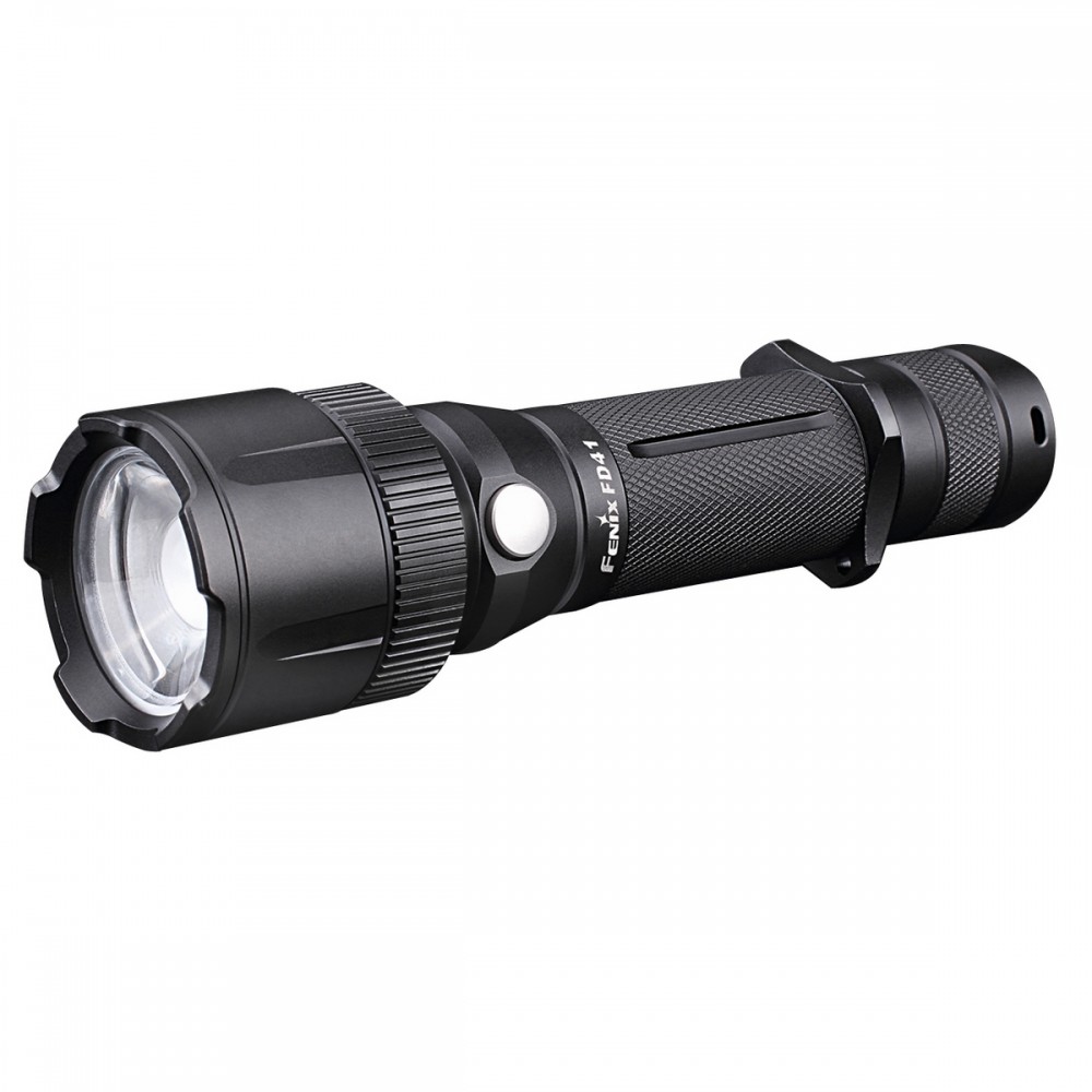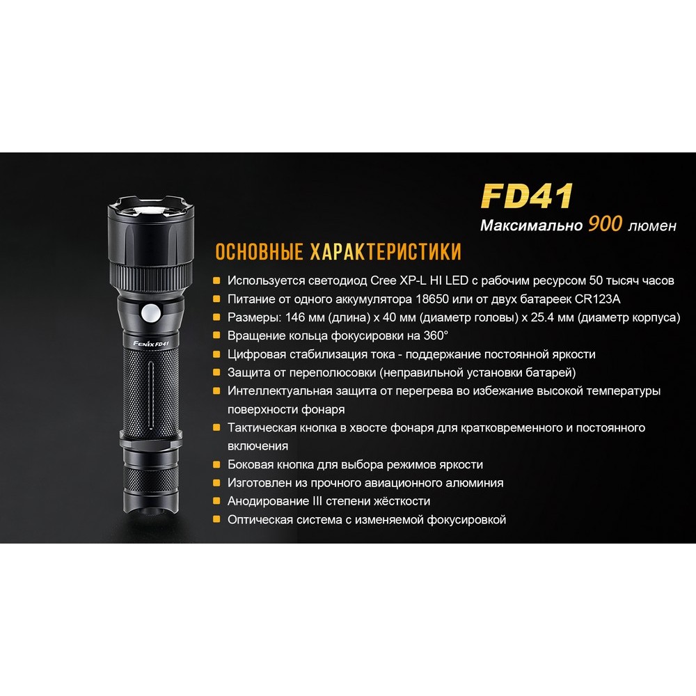 Модель Fenix FD41 вошла в одну из новых серий фонарей бренда Fenix, объединяющую экземпляры с подвижной передней линзой. Такая особенность конструкции позволяет более гибко управлять освещением, ведь помимо пяти режимов работы, пользователь может выбрать дальность освещения, а вместе с этим – ширину луча. Фокусное расстояние встроенной линзы фонаря легко меняется при вращении кольца, располагающегося в районе головы прибора. Это кольцо возвращается на 360°. В зависимости от его положения, ширина луча фонаря может достигать 81°, благодаря чему создается равномерное заливное освещение на близкой и средней дистанции. В том положении, когда луч наиболее сфокусирован, он освещает объекты на дальней дистанции. Максимальная дальность для Fenix FD41 составляет 340 метров. Фонарь поддерживает 5 режимов работы на базе диода Cree XP-L, который, кстати, в состоянии проработать без проблем 50 000 часов. Самый яркий свет в режимах Strobe (быстро мерцающие вспышки) и Turbo (постоянное освещение с яркостью около 900 люмен). Если фонарь использует аккумулятор Fenix на 3500 мАч, его заряд сможет поддерживать данный режим в течение 1 часа 40 минут. А дальность луча можно изменять в рамках 47-340 метров. Второй по яркости режим – High (в нем фонарь дает 350 люмен). В этом случае, дальность луча составляет 30-218 метров, а общее время работы фонаряика – 3 часа 50 минут. Третий по яркости – это режим Mid. Он рассчитан на 150 люмен, продолжительность освещения – 10 с четвертью часов и освещение на расстоянии 20-141 метр. Наименьшую яркость дает режим Low – 10 люменов. Используя его, можно освещать территорию на расстоянии 6-37 метров и работает 150 часов. Кроме аккумулятора литий-ионного типа 18650, Fenix FD41 также в состоянии работать на литиевых батареях CR123А. Однако, в отличие от аккумулятора, их в комплекте должно быть две. Для управления фонарем производители предусмотрели сразу две кнопки, функции между которыми распределены. Торцевая кнопка служит для краткосрочного или постоянного включения, а боковая – для выбора нужного режима. Также следует сказать о системе защиты Fenix FD41 от всяческих повреждений. В данный фонарь интегрированы механизмы защиты от короткого замыкания, переполюсовки элементов питания, от перегрева. Алюминиевый корпус защищает от ударов, царапин, намокания. Оболочка данной модели полностью влагоизолирована, что описана стандартом IP-68. Это наиболее высокая степень защищенности, позволяющая свободно использовать фонарь в любых туристических или иных условиях. Особенности:- фонарь с яркостью 900 люмен;
