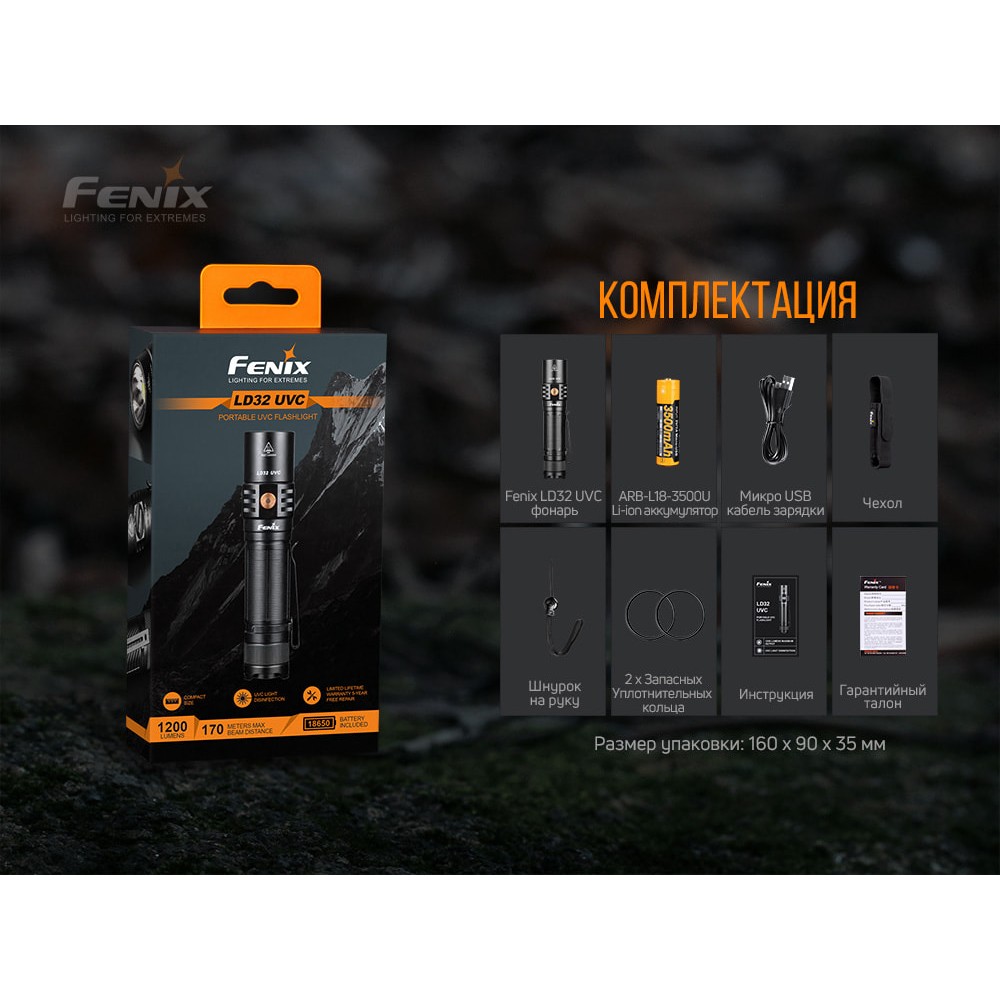 Модель фонари Fenix LD32 UVC, батарея ARB-L18-3500U Li-ion, кабель micro-USB, клипса, ремешок, чехол, два запасных уплотнительных кольца, руководство пользователя, гарантийный талон.