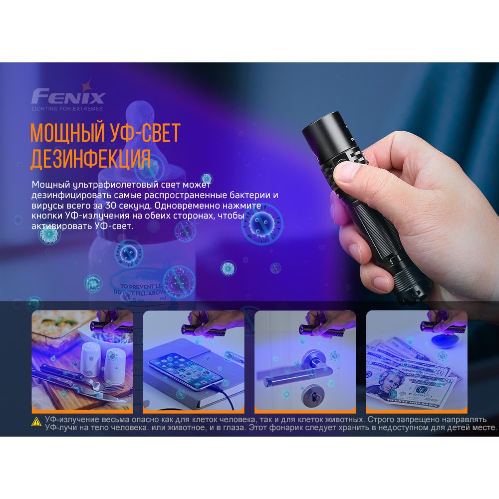 Фонарь модели Fenix LD32 UVC – прибор с ультрафиолетовым излучением, также может применяться с обычным светодиодом как уличный вариант. Этот многофункциональный фонарь работает на одной литий-ионной батарее 18650 и дает свет наибольшей яркостью в 1200 люменов. При этом расстояние действия луча составляет 170 метров. Круглый переключатель позволяет быстро выбирать необходимый уровень яркости. Боковые кнопки служат для активации ультрафиолетового освещения.