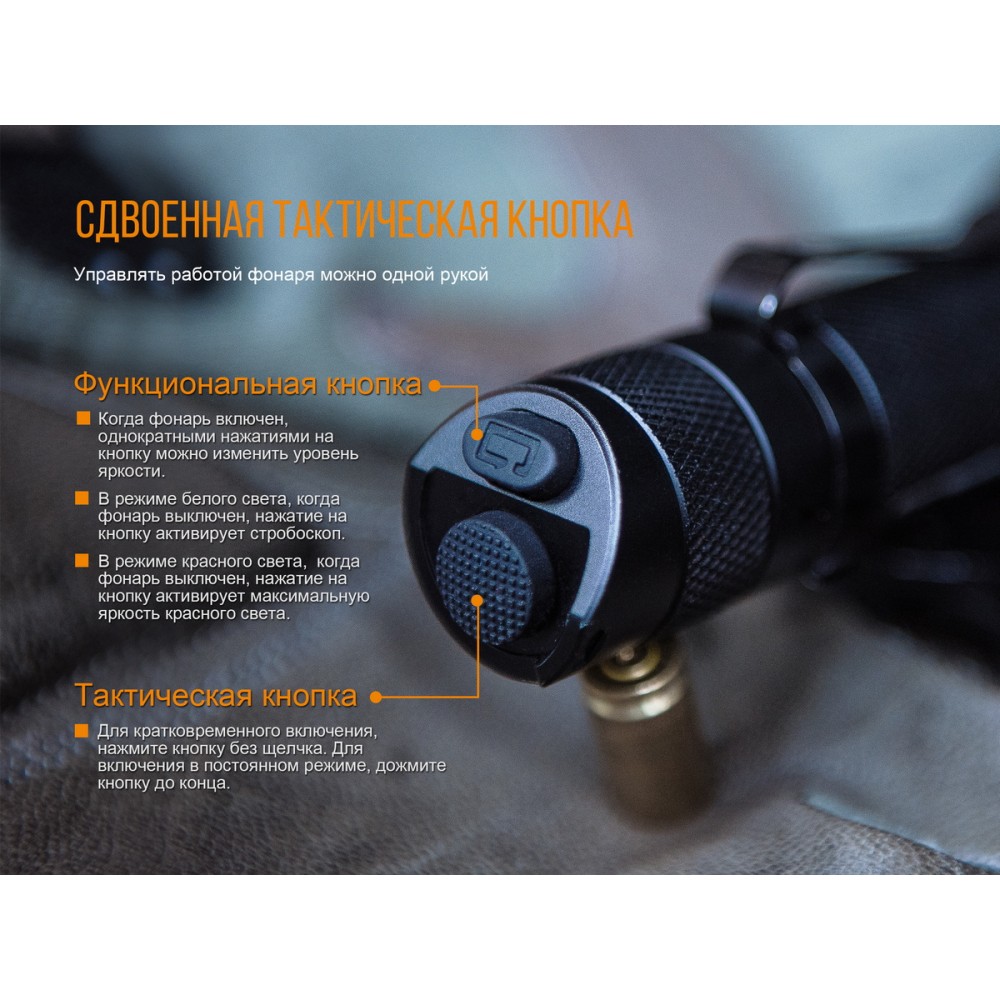 Несмотря на большой выбор режимов освещения, у модели TK25 Red очень грамотно реализована система выбора нужного из них. Во-первых, пользователю необходимо вернуть главный элемент корпуса, чтобы определить, какой из диодов будет работать при включении. Это можно сделать и тогда, когда фонарь уже работает, если нужно использовать освещение другого цвета. Во-вторых, в хвостовой части корпуса расположены 2 кнопки, которые и выполняют другие операции по управлению фонарем. Круглая кнопка называется тактической – она включает в себя TK25 Red. Если нажать эту кнопку, не до конца, то свет включится в режиме мгновенного доступа. Он погаснет снова, как только пользователь отпустит кнопку. Если свет нужно включить надолго, необходимо нажимать кнопку полностью – до характерного щелчка. Вторая кнопка сделана овальной, чтобы владельцу фонаря было легче ориентироваться. Она позволяет выбрать подходящий уровень яркости каждого из диодов. Эта же кнопка активирует мигающий режим, если держать ее нажатой немного дольше, когда работает белый диод. При этом все уровни яркости запоминаются интеллектуальной системой фонаря для быстрого включения во время следующего сеанса.