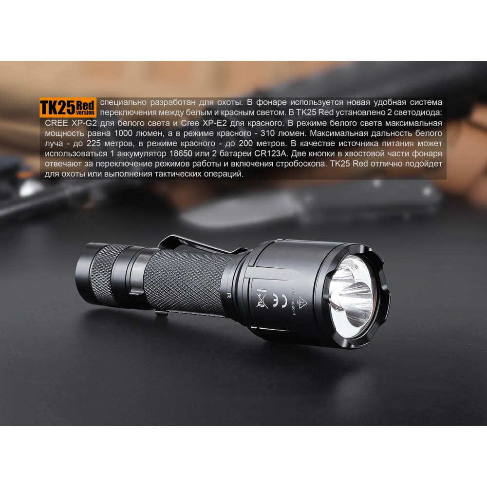 Белый свет для TK25 Red обеспечивает диод Сге XP-G2. Он работает в 4 режимах яркости постоянного света и одном сигнальном режиме:
