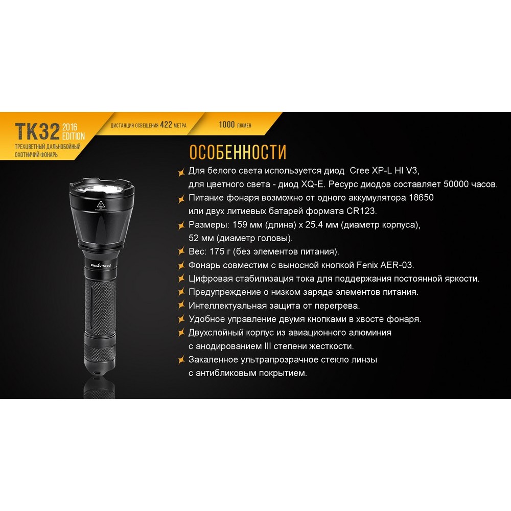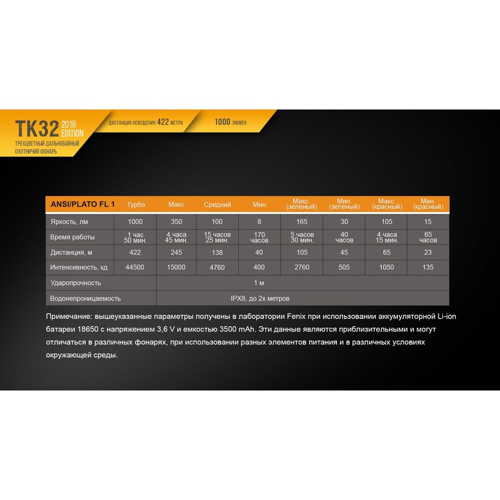 Гарантия: Покупатели фонарей Fenix TK32 в редакции 2016 года пользуются официальной гарантией на них в течение пяти лет.