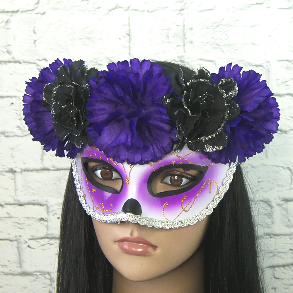 Маска День мертвых (фиолетовая) (Halloween Scary Horror mask) изготовлена из пластика. Маска с фиолетовыми и черными хризантемами закрывает половину лица. Размер изделия : универсальный. Маска для вечеринки надежно фиксируется на голове с ленточек. Дополнить свой устрашающий образ на Хэллоуин можно с карнавальными аксессуарами: Митенки длинные, перчатки гипюровые короткие или длинные, грим палитра (8 цветов), чулки Шнуровка с бантом Карнавальные маски принесут изюминку в образ вашего персонажа на тематической вечеринке, карнавале или маскараде. Многообразие образов, безусловно, облегчит Ваш поиск оригинального образа. Наш магазин предлагает карнавальные аксессуары оптом и для дропшипперов, вы можете оформить заказ на сайте Подарок-ТУТ и задать любые интересующие вопросы менеджеру, заказав звонок на нашем сайте.