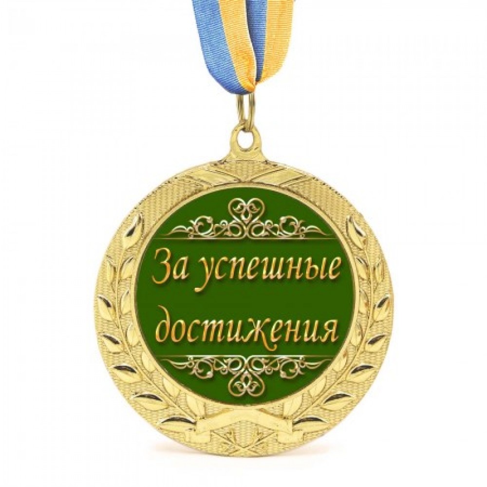 Подарочная медаль За успешные достижения- замечательная многоцелевая и необычная награда, ее можно вручить сослуживцу или сотруднику, либо наградить отличившегося в коллективе. Хотите подчеркнуть завершение ВУЗа студента либо поздравлять собственного ребенка с завершением школы? Подарочная медаль За успешные достижения в золотом обрамлении лавровых листьев - произведет действительно приятное и запоминающееся надолго впечатление и несомненно будет замечательным подарком на память! Медаль сделана из сплавов самых разных металлов с покрытием благородного золотого цвета нанесённого булатным способом, диаметром 7 см, размером жетона 5см и жёлто-голубой репсовой лентой длиною 40см, упакована в красочную картонную коробку. Медаль не подойдет для выполнения на ней гравировки. Среди нашего большого ассортимента товаров, Вы сможете найти много оригинальных и необычных подарков для самых разных мероприятий.Дополнительная информация: