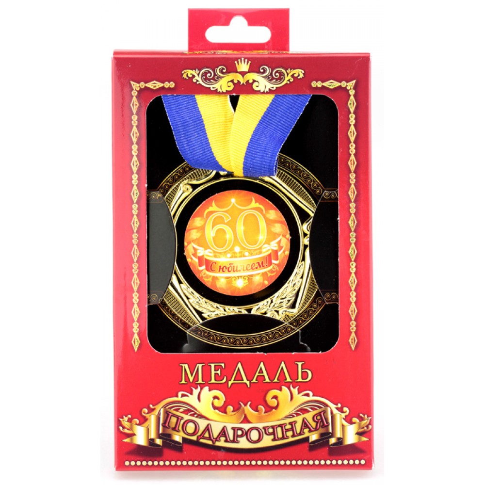 Юбилейная подарочная медаль на день рождения 60 лет.Поздравьте юбиляра с др ярко и красиво! Вручите ему торжественно вот такую поздравительную медаль. Материал - цветной металл, двухцветная тканевая лента. На обороте медали - место для подписи и короткого пожелания. Упаковка - фирменная демо-коробка с подставкой и петлей.
