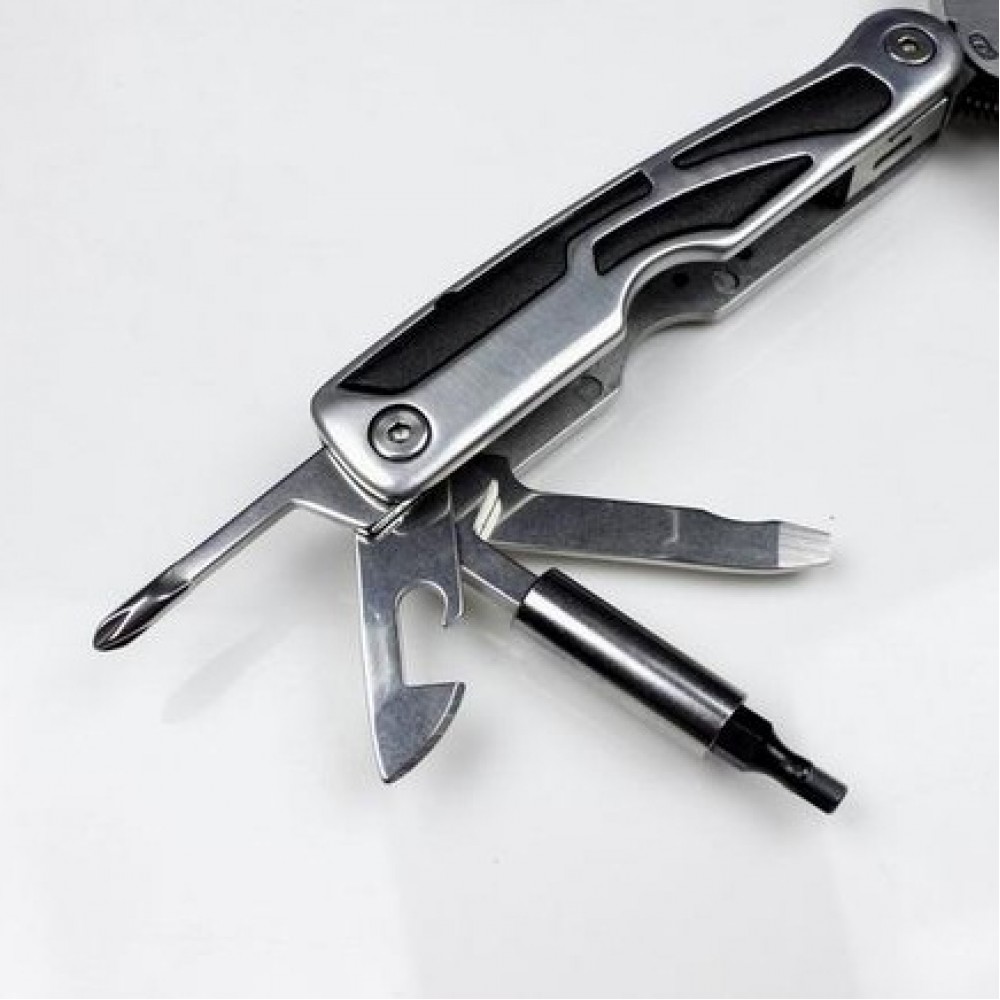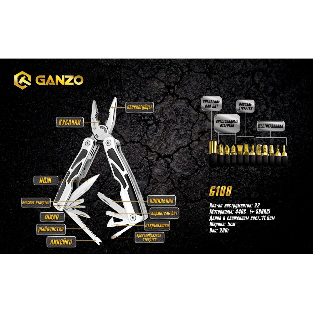 Удобный мультитул G108 от компании Ganzo, в первую очередь, предназначен для любителей рыбалки. В комплект мультитула G108 входят следующие инструменты: подпружиненные плоскогубцы с кусачками, лезвие с прямой заточкой, приспособление для чистки рыбы с напильником, приспособление для извлечения рыболовных крючков, плоские отвертки двух размеров, небольшая крестовая отвертка, зенки, открыва. Также отдельно в комплект мультитула G108 входят (в отдельной кассете): переходник-адаптер и набор сменных бит (3 плоских отвертки, 3 крестовых отвертки, 3 шестигранных ключа наиболее популярных размеров).