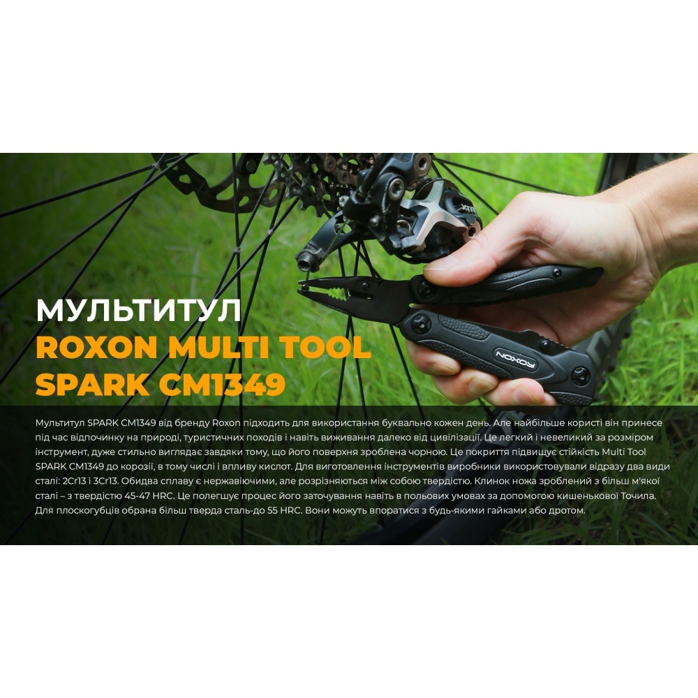Мультитул SPARK CM1349 от бренда Roxon подходит для использования практически каждый день. Но больше всего пользы он принесет во время отдыха на природе, туристических походов и даже выживания вдали от цивилизации. Это легкий и небольшой по размеру инструмент, в который заложилось 14 разных функций. Он должен преобладать в 226 г. Длина составного инструмента составляет 10,7 см при ширине 4,5 см и толщине 2,3 см. В рабочем положении его длина увеличивается до 16,1 см. Инструмент очень стильно смотрится благодаря тому, что его поверхность сделана черной. Это покрытие повышает стойкость Multi Tool SPARK CM1349 к коррозии, в том числе и действию кислот.