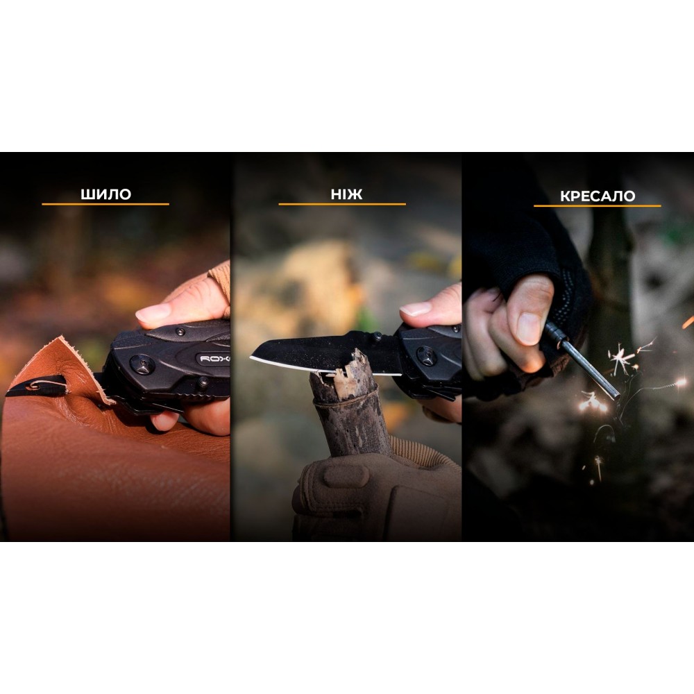 Что касается других инструментов, то это пила для дерева, широкое заточенное шило с отверстием для нити, отвертки с прямым и крестообразным шлицем, открывалка для банок с консервами. Отдельным инструментом является огниво, которое можно полностью достать из одной из ручек мультитула. У огнища есть удобная ручка, в которую также встроен свисток.