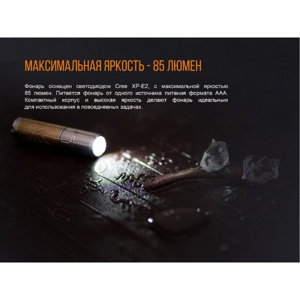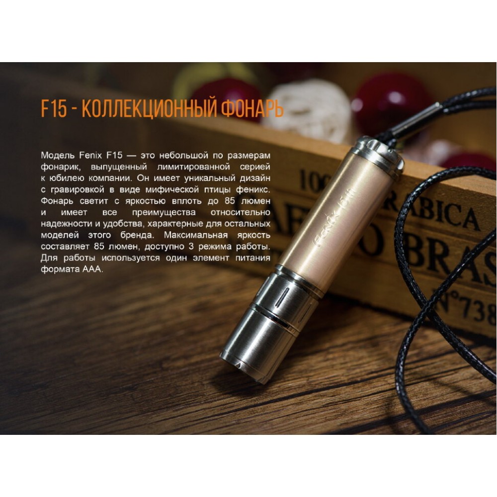 Фонарь F15 был разработан и выпущен к 15-летнему юбилею компании Fenix. Эта серия является лимитированной и отличается уникальным дизайном. Часть корпуса фонаря имеет цвет розового золота с рельефным изображением птицы феникс. F15 – совсем небольшой фонарь и его можно носить в качестве брелока со связкой ключ. Несмотря на это, данная модель поддерживает работу в трех разных режимах. Самый яркий из них называется High предлагает 85 люмен света. Это достаточно, чтобы радиус освещаемой территории составлял 45 метров. В режиме средней яркости фонарь светит на 25 люмен, освещая территорию в радиусе 18 метров. В третьем, самом экономном, режиме фонарь имеет яркость 8 люмен и светит на 8 метров вдаль.