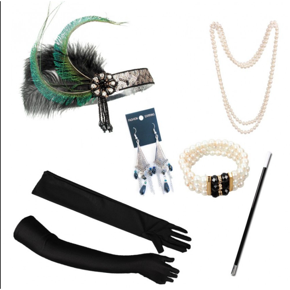 Этот набор — словно яркий штрих на чёрно-белом полотне двадцатых. Зелёные перья повязки придают образу свежесть и дерзость, жемчужные нити создают атмосферу винтажной роскоши, а браслет и серьги расставляют нужные акценты. Длинные перчатки добавляют элегантности, а мундштук завершает образ в духе тех времён, когда каждая деталь говорила о вкусе и стиле. Набор идеально подойдёт тем, кто хочет создать готовый образ без долгих поисков и лишних трат — всё продумано до мелочей, остаётся только надеть и блистать на вечеринке или фотосессии.