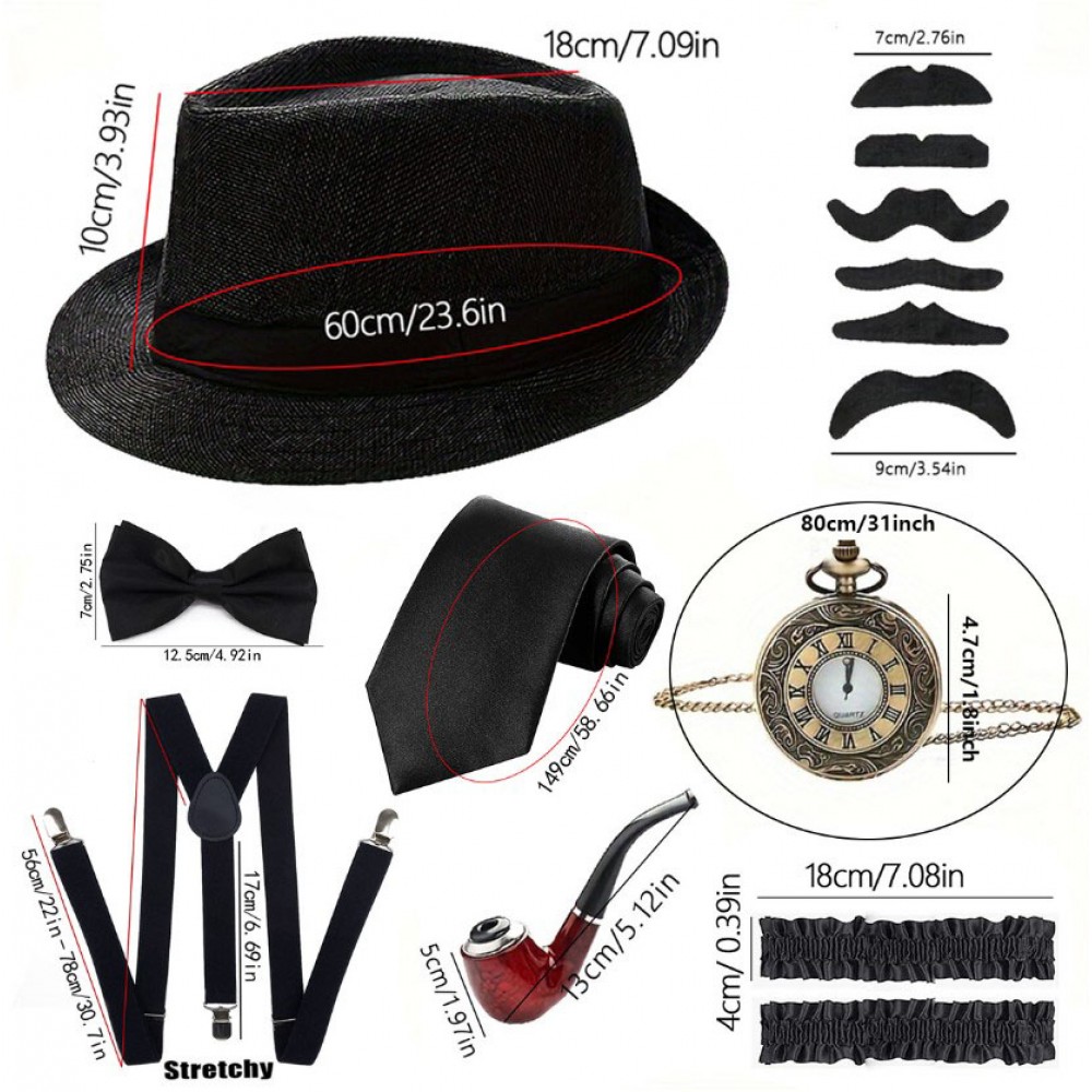 Этот набор в стиле Чикаго 1920-х создан специально для тематических вечеринок, костюмированных мероприятий и фотосессий. Комплект из восьми аксессуаров полностью повторяет атмосферу гангстерской эпохи: лаконичная черная круглая шляпа, винтажная цепочка-карманные часы, искусственная трубка, набор усов, строгий галстук, бабочка и эластичные подтяжки — все элементы сочетаются между собой, создавая готовый образ в стиле Great Gatsby / Peaky Blinders.
